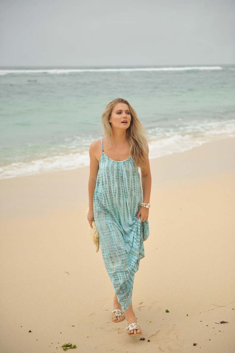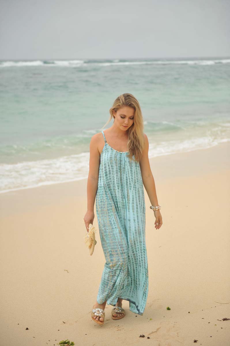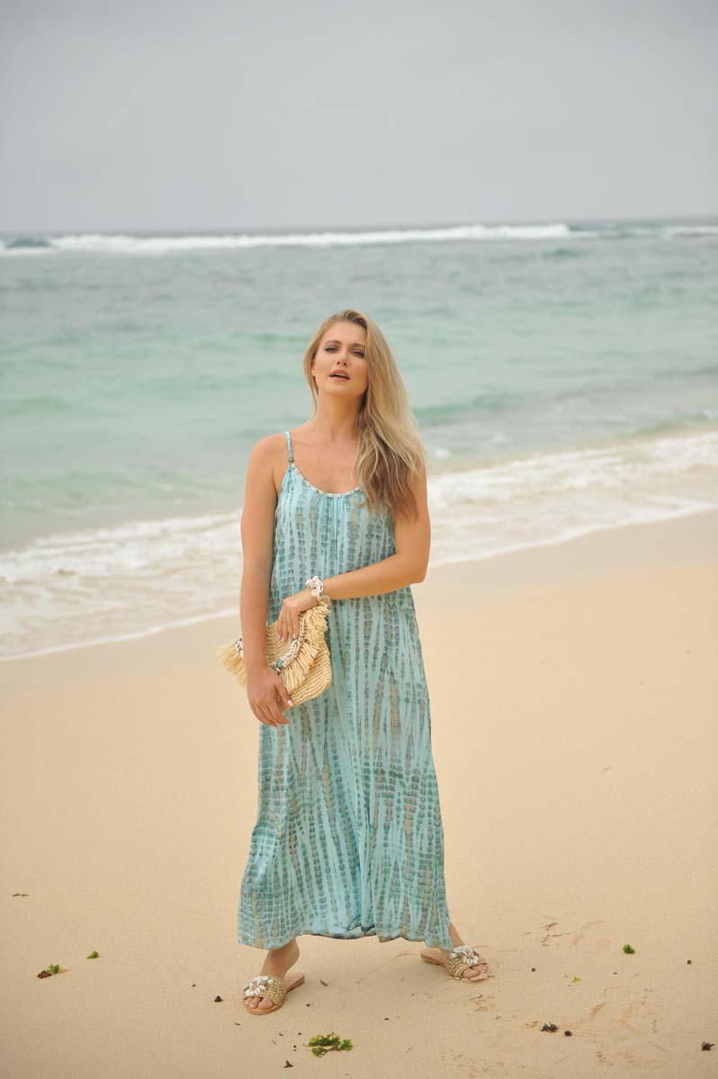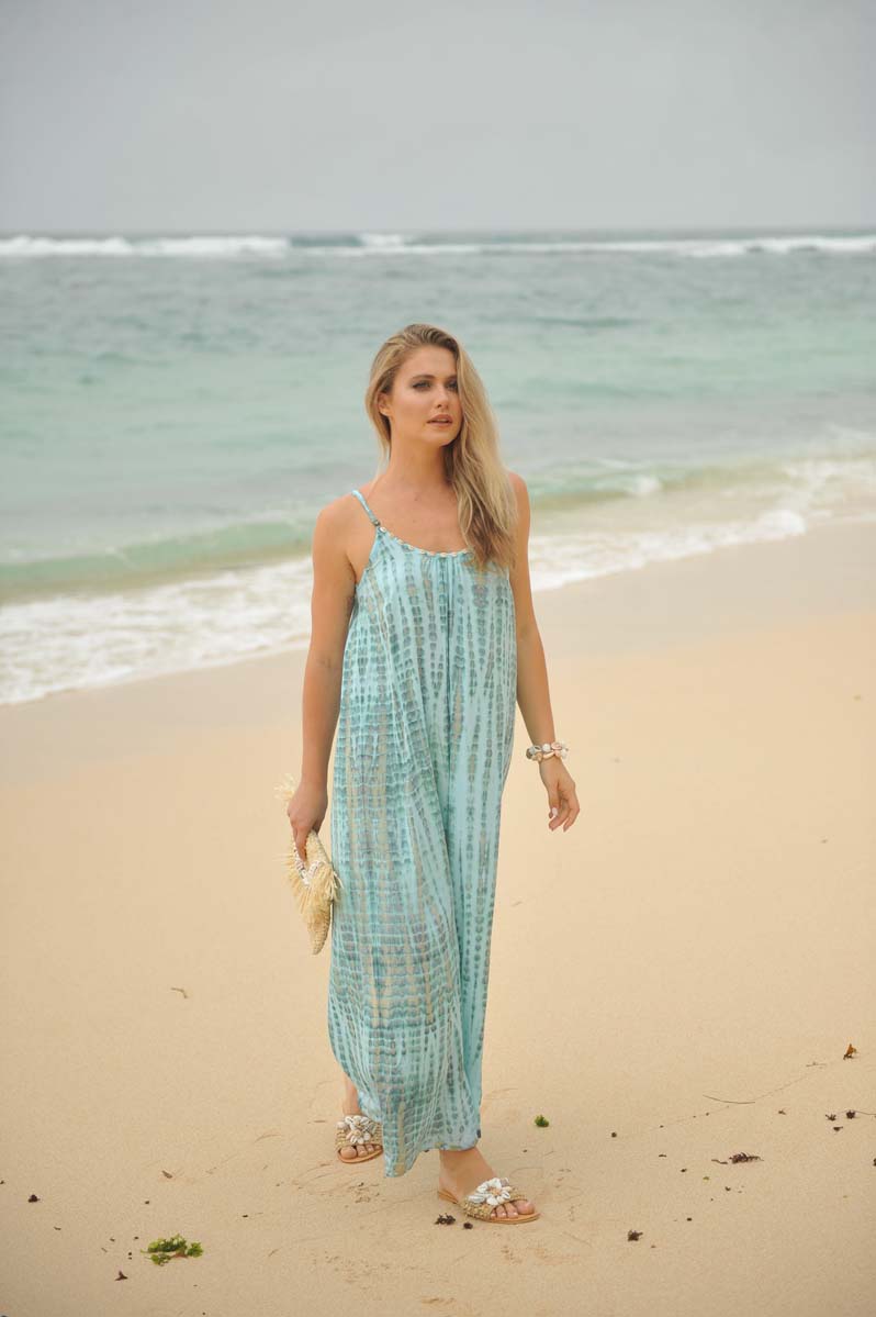 De maxi jurk is pastelgekleurd in Aqua, turquoise, taupe en beige.