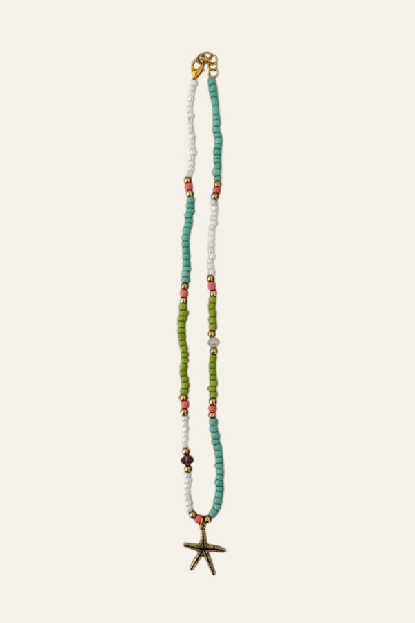 Zomer in een sieraad! De Bon Bini ketting is vrolijk, kleurrijk en helemaal tropisch. Deze meerstrengige ketting is gemaakt met een speelse mix van kralen in felroze, goud, wit, en nog veel meer kleuren – met als blikvanger een hanger in de vorm van een schelp of zeester.