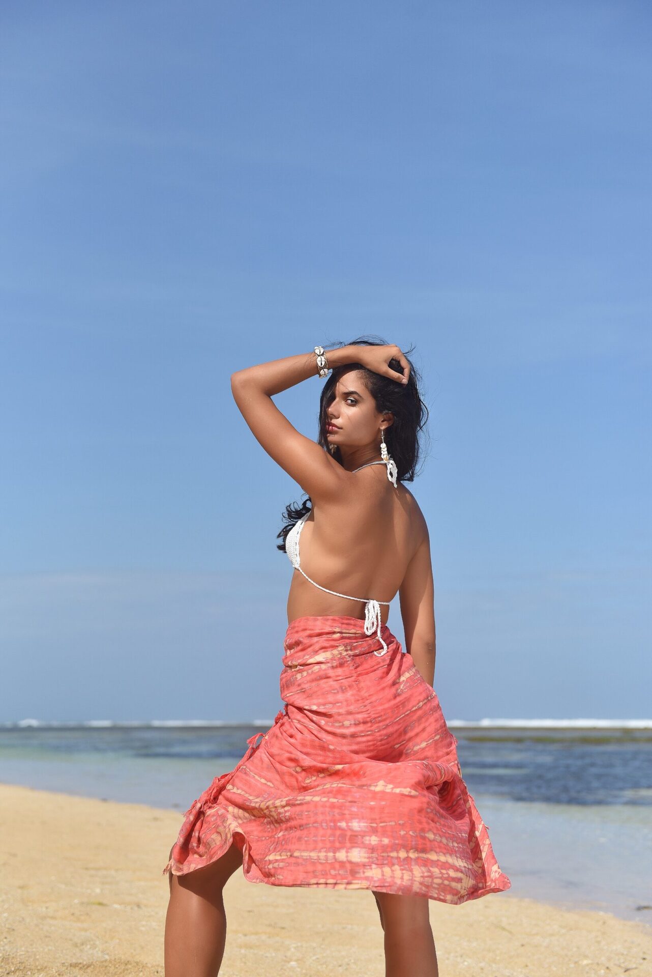 Ook handig voor elk avontuur, weegt bijna niets en je hebt altijd een handdoek of voor gelegenheden waarbij je meer bedekking wilt, zoals het bezoeken een tempel. Deze Sarong is volgens de tie-dye methode geverfd, de kleur is geïnspireerd op de mooie oranje rode kleur van de ondergaande zon die je veel ziet op Bali, daar waar deze jurk met de hand gemaakt is op een fair trade manier, waar we heel erg trots op zijn in deze tijd, elke print is daardoor uniek de stof is 100% rayon en valt soepel en zacht en is heerlijk koel in het dragen, en weegt bovendien bijna niets in je koffer, dus deze gaat zeker mee!