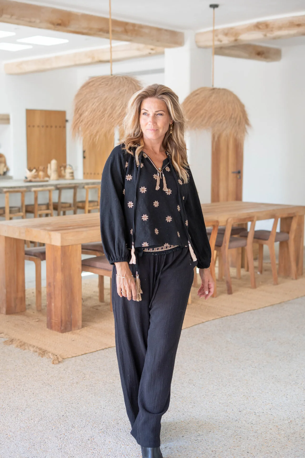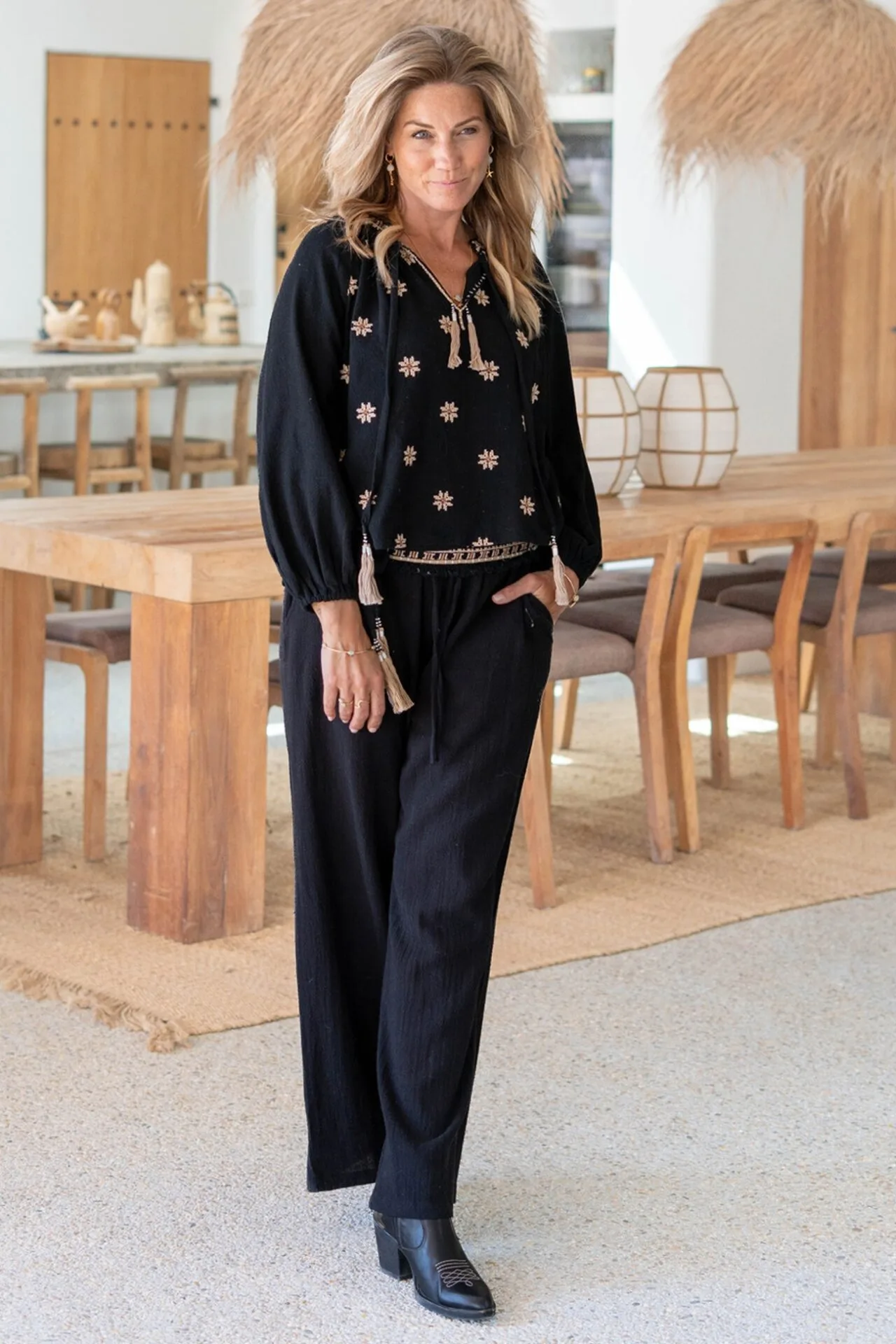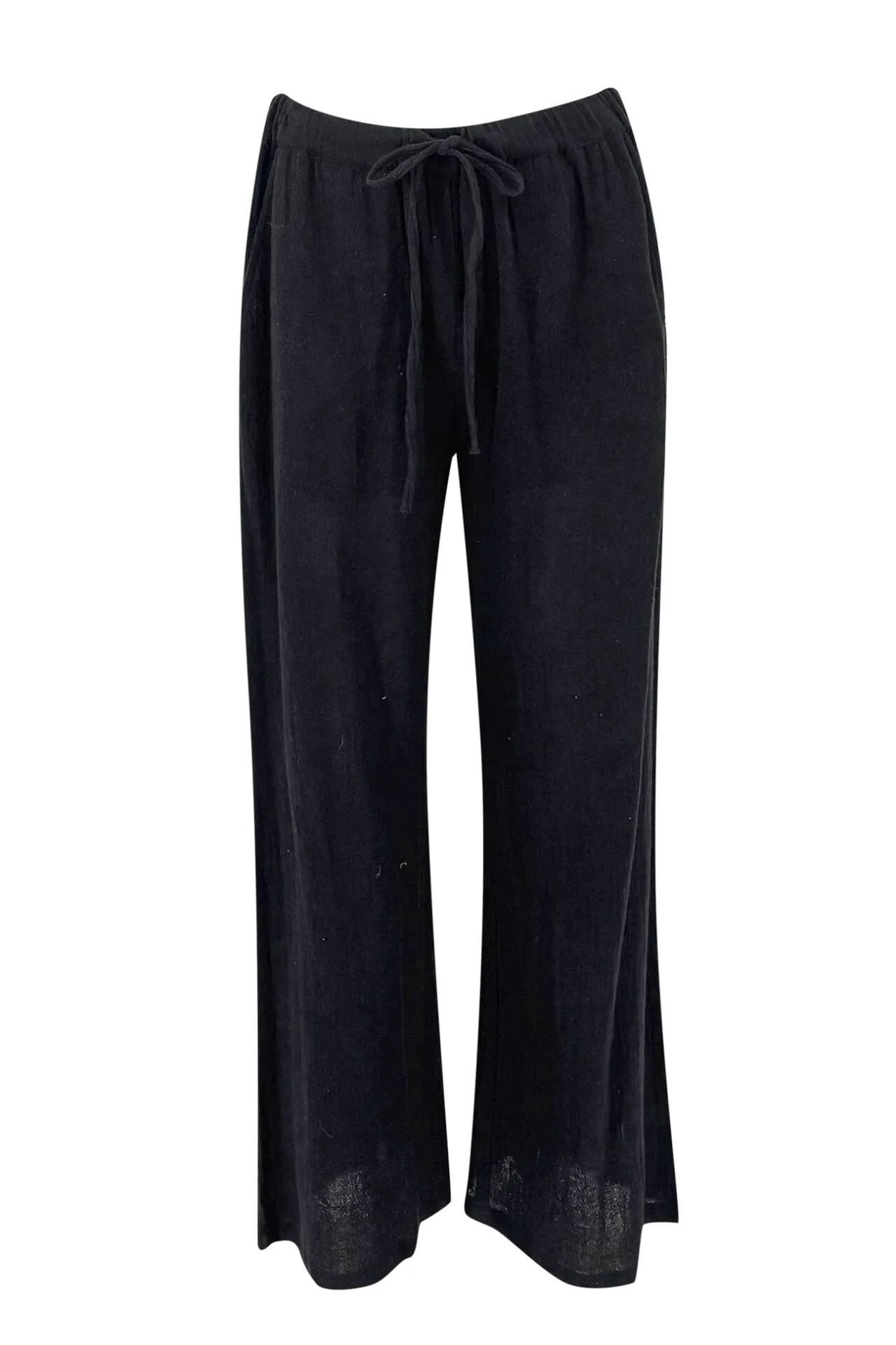 Wijde broek met steekzakken en elastiek met een trekkoord in de tailleband.