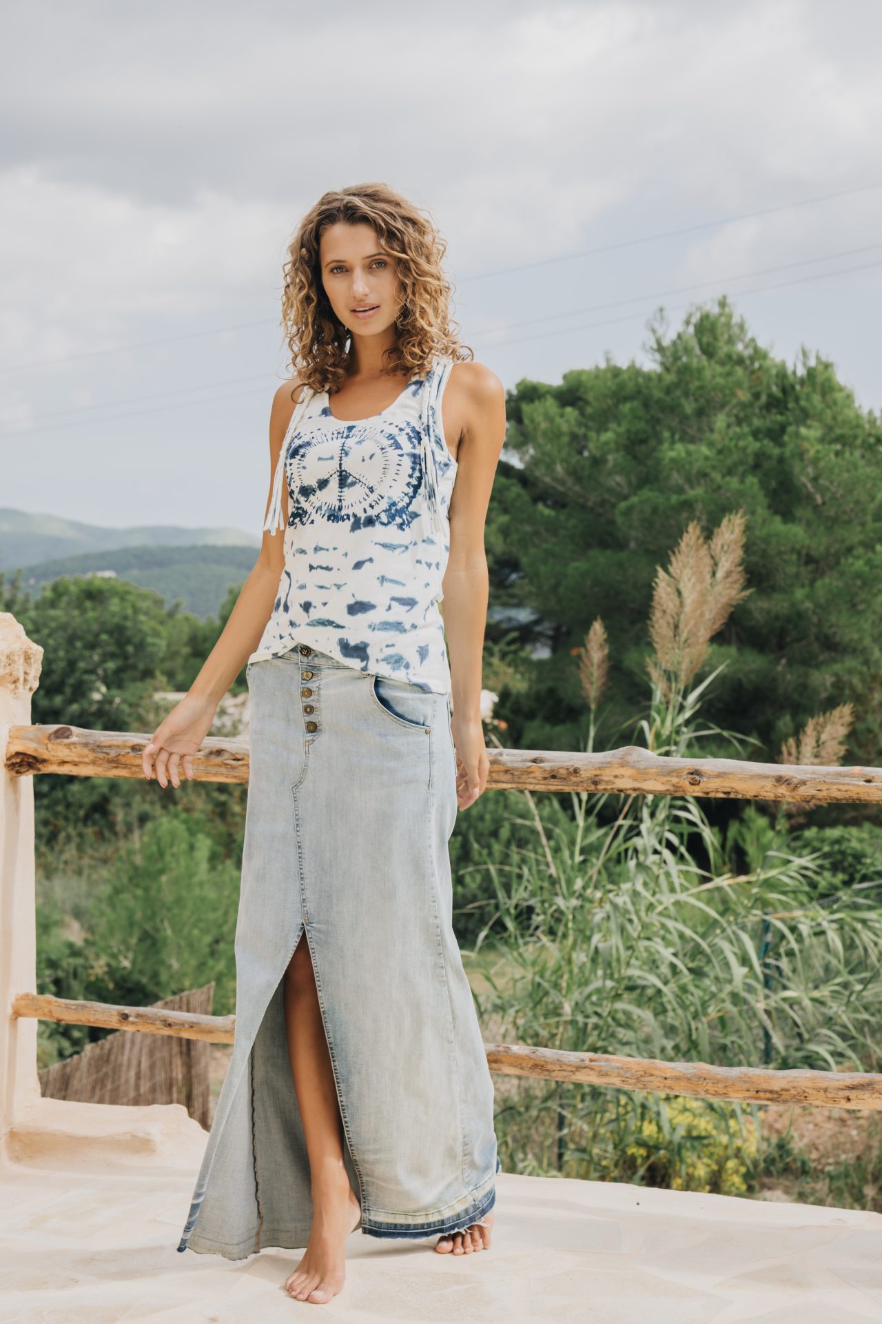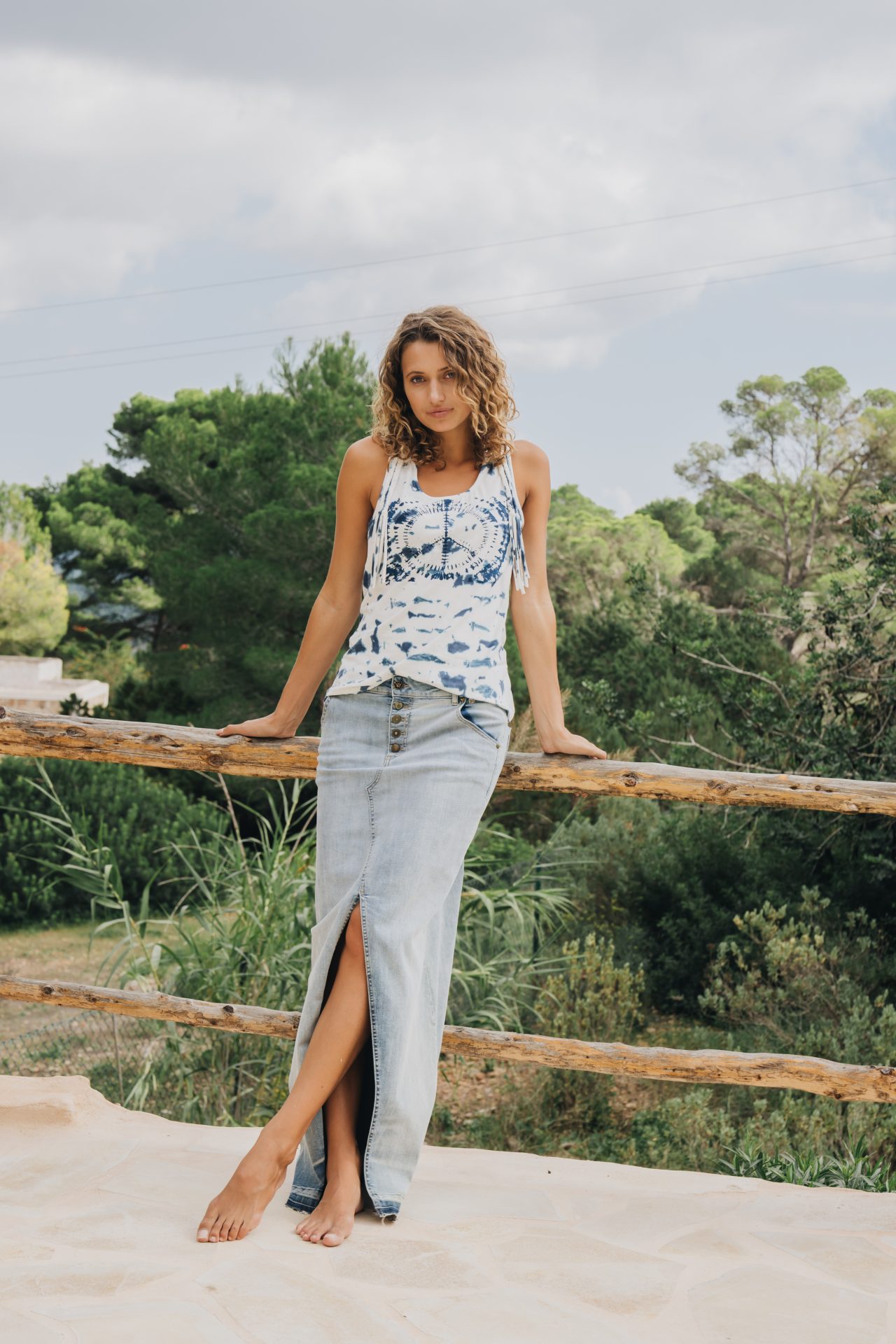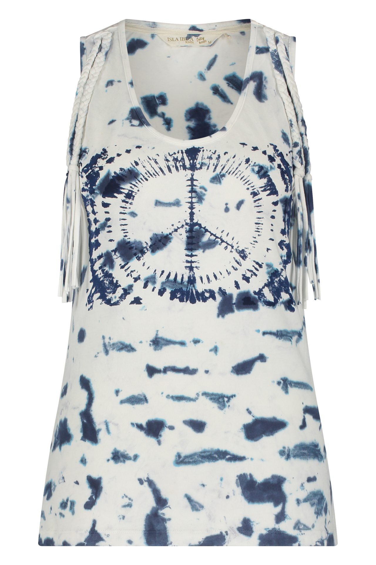 Geverfd volgens de Tie dye methode in de kleuren wit en blauw, zo krijg je een echte bohemian style.