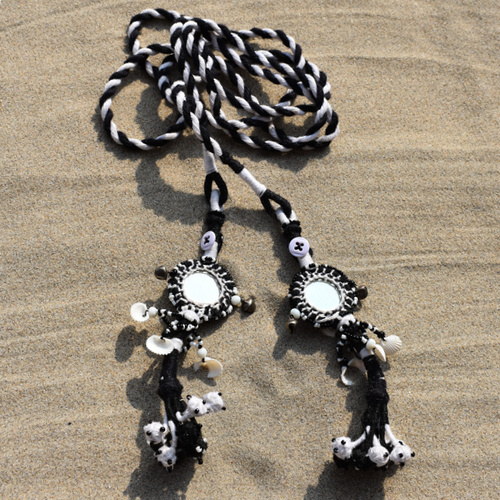 The belt is made of cotton, has a tassel with balls at both ends and a mirror further decorated with beads and shells and two bells.