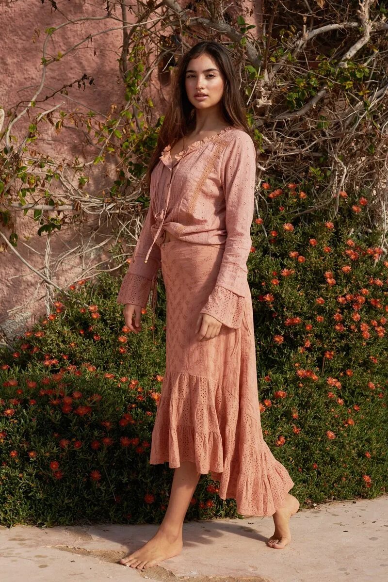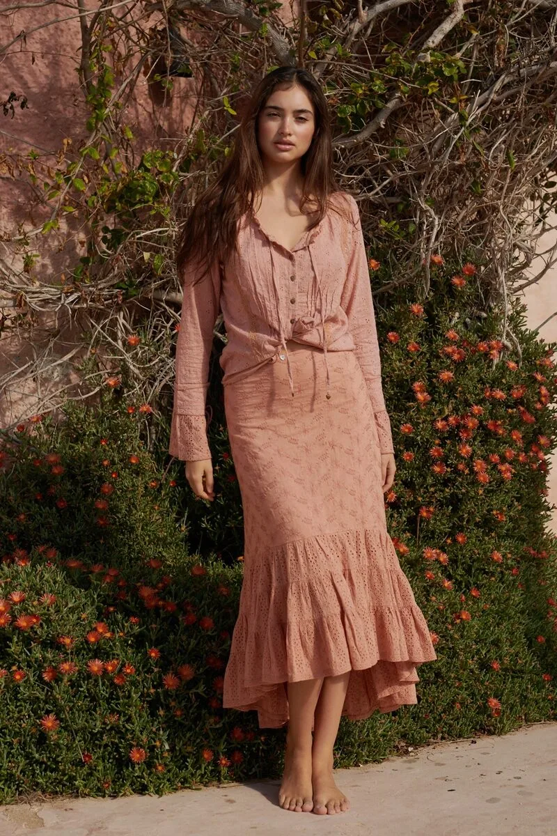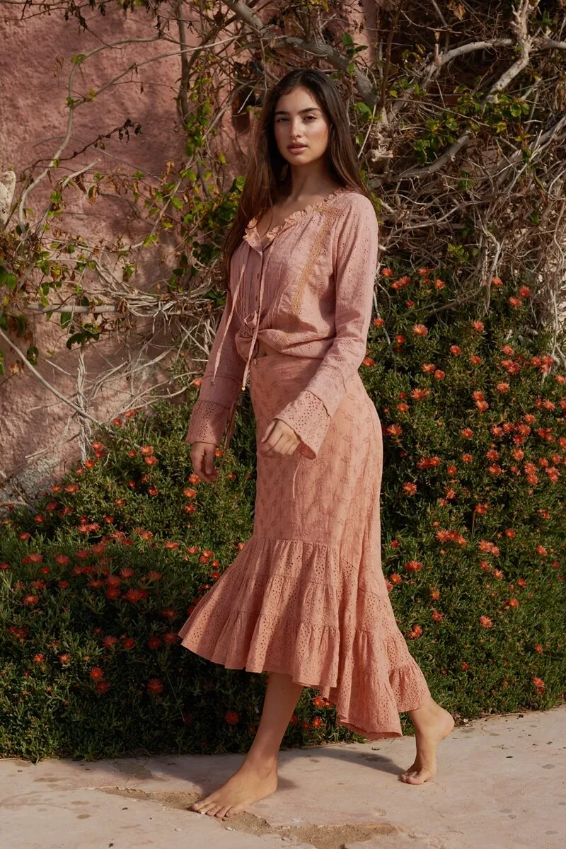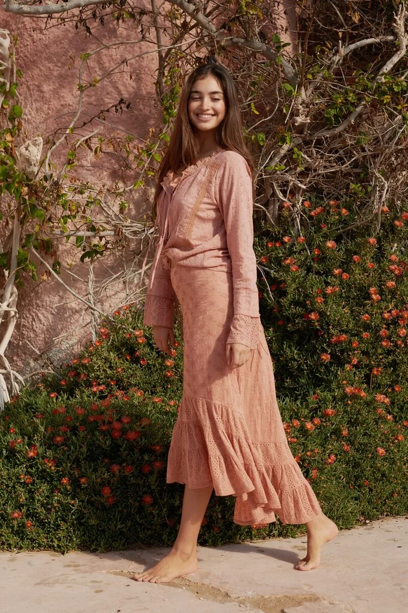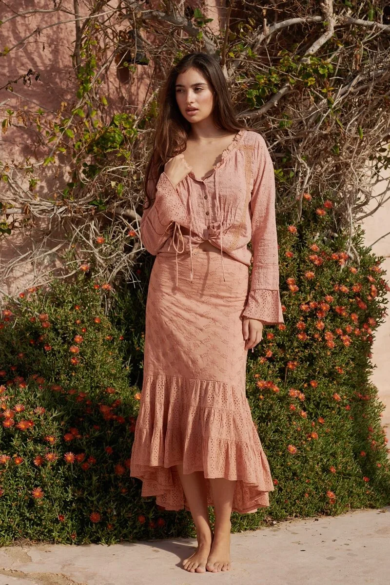 Deze light terra kleurige rok is de perfecte match bij de heel veel items uit deze zomercollectie, maar ook op zichzelf een echte blikvanger. De rok is gemaakt van verschillende stoffen, waaronder twee soorten broderie, die samen een speels en verfijnd geheel vormen. De combinatie van texturen geeft de rok die typische romantische boho-uitstraling.