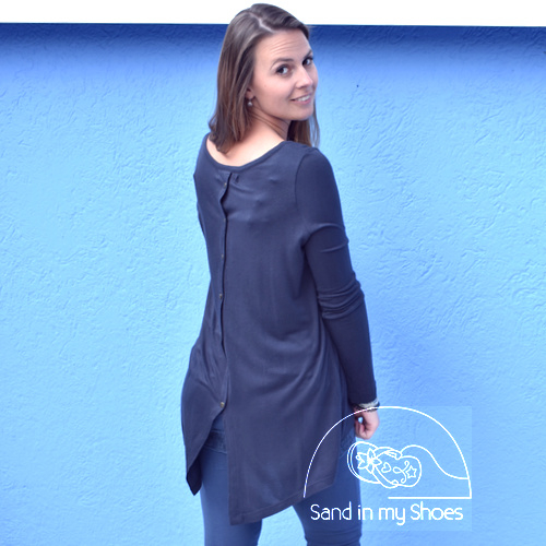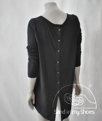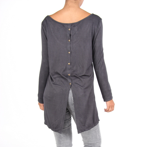 Long top van Isla Ibiza afgewerkt met knoopjes aan de achterkant. De top heeft een kleine split aan de achterkant met die geopend kunnen worden. De top is gemaakt van een zachte stof en heeft een comfortabele fit.