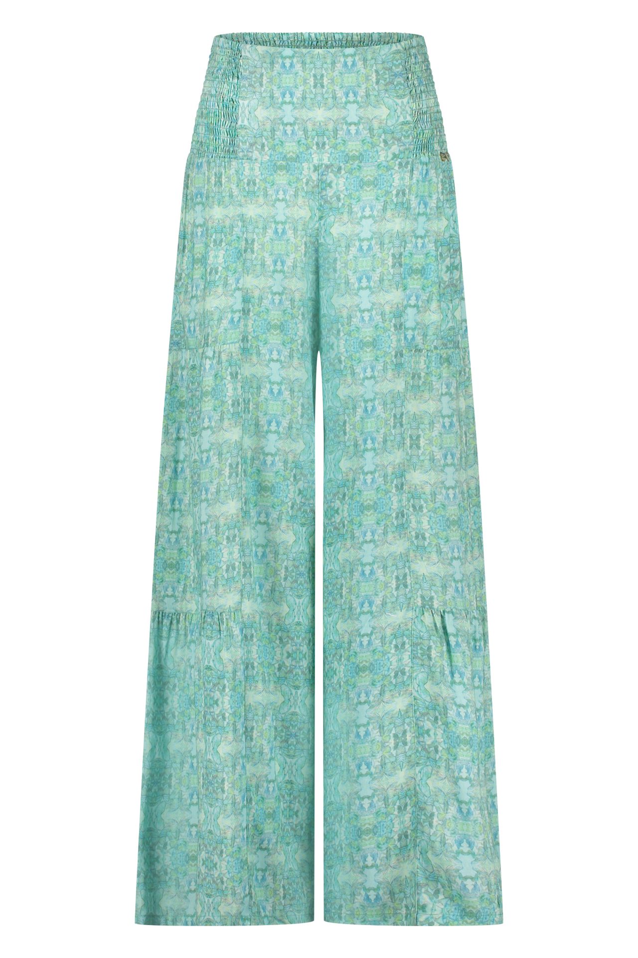 De broek heeft mooie flair pijpen en heeft een deels gesmokte heup band, dit zorgt voor een zeer fijn draagcomfort.