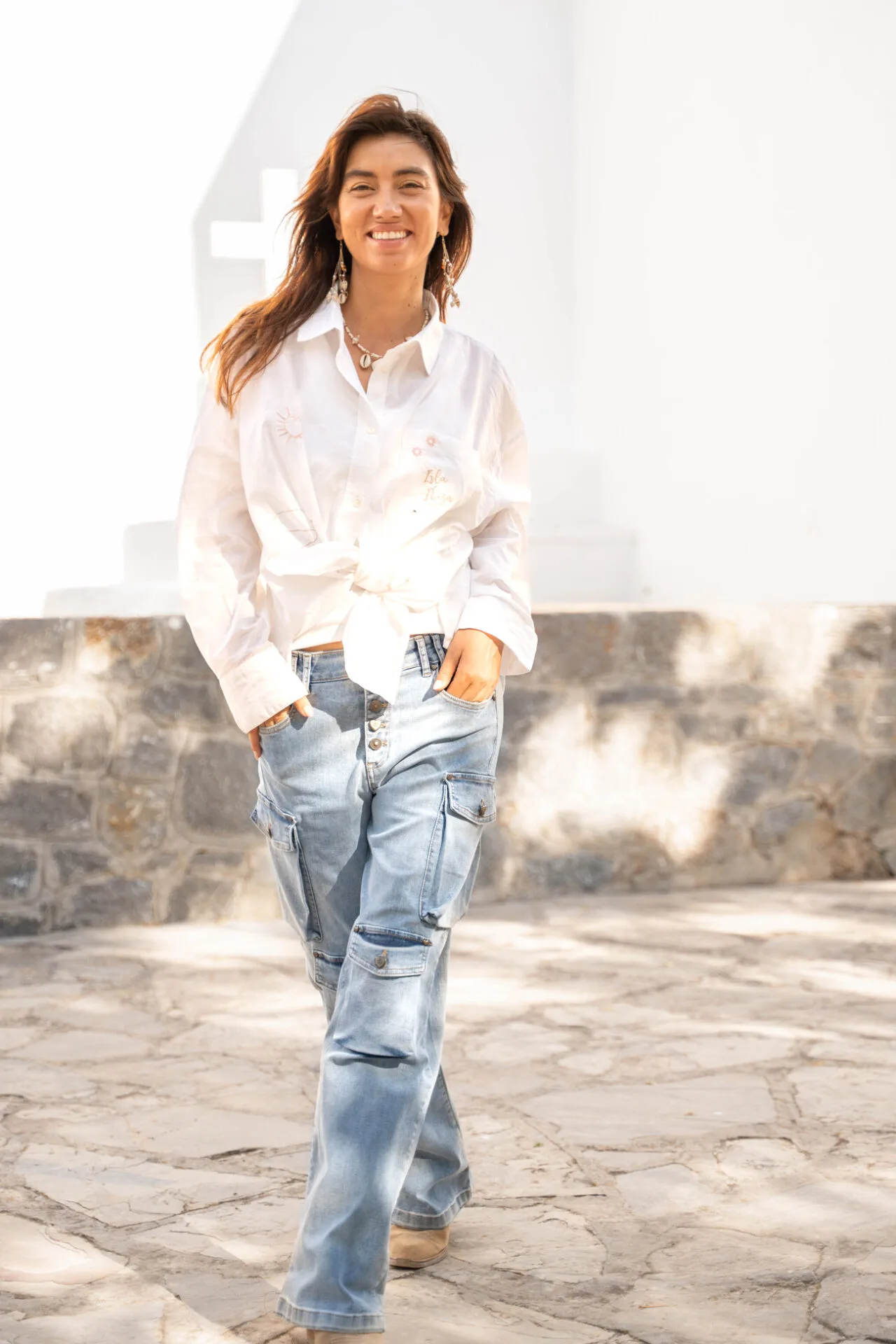 Draag haar op een flared jeans voor een elegante Ibiza look of combineer met een print rok voor een meer uitgesproken outfit. Binnen Isla Ibiza draait alles om contrast en harmonie, en deze witte geborduurde blouse dames sluit daar perfect bij aan.