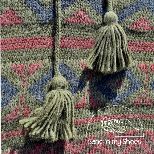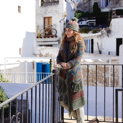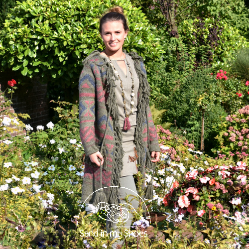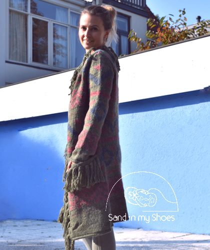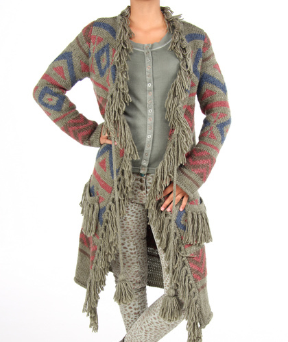 Grof gebreid vest van Isla Ibiza, heeft een lang model in een print en met franjes. De cardigan heeft twee zakken en kan worden dichtgeknoopt met de touwtjes waar kwasten aanhangen.