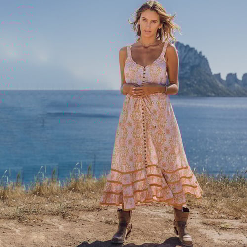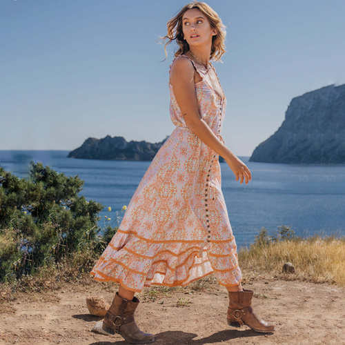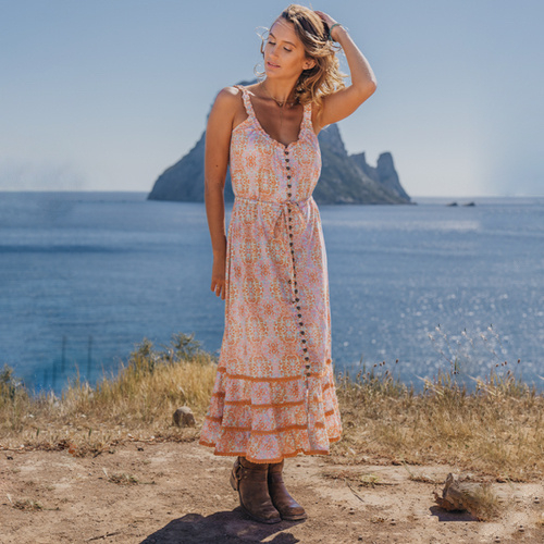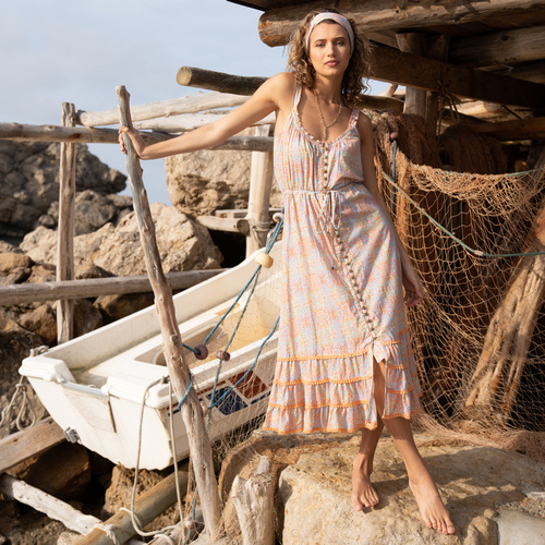 De jurk heeft een mooie bohemain print in de kleuren oranje, blauw, roze en is gemaakt van een mooie 100% katoen.