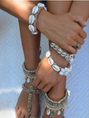 Pulsera de Hot Lava, tiene una banda estrecha y está adornada con conchas. La pulsera se cierra con un cierre de trabilla y botón.