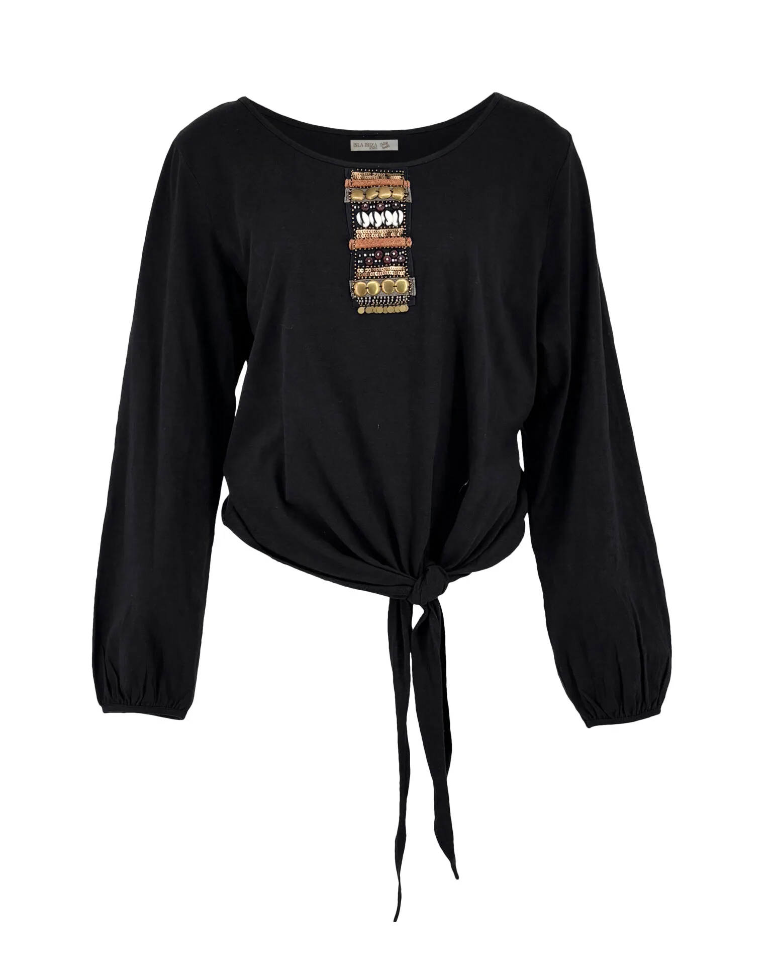 Shirt met lange mouwen en knoop detail aan de onderkant, wijde ronde hals, versiering op de voorkant.