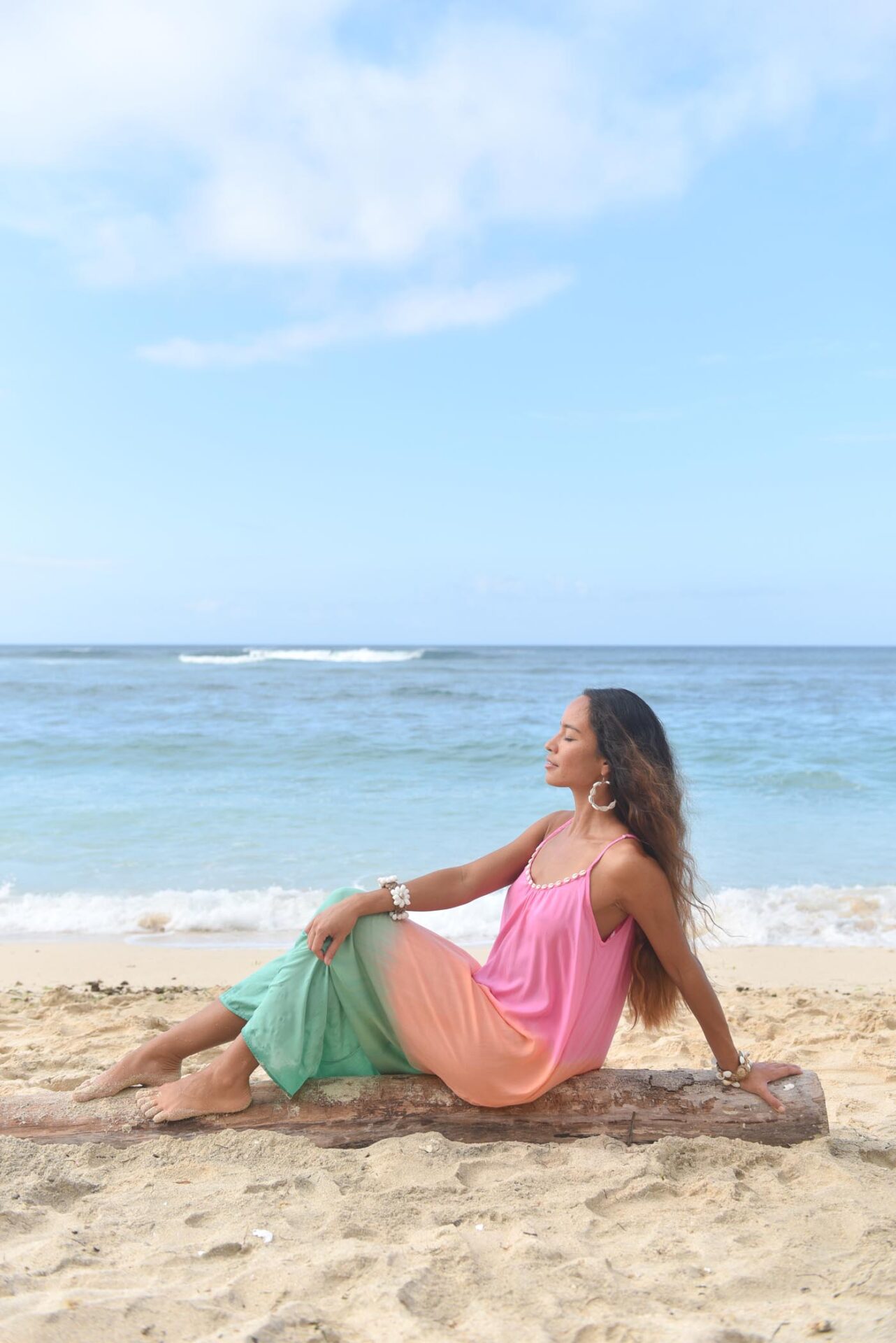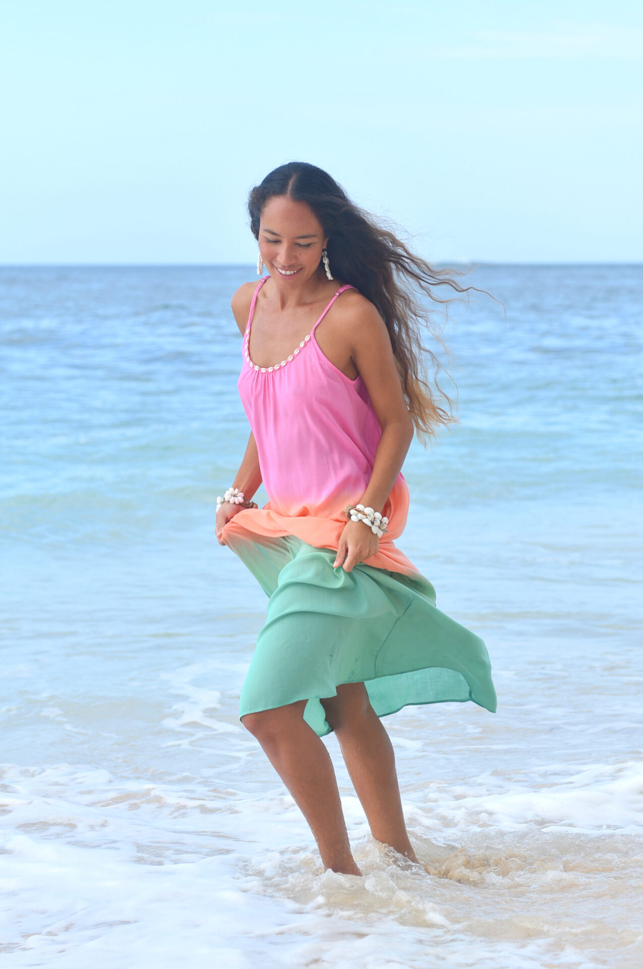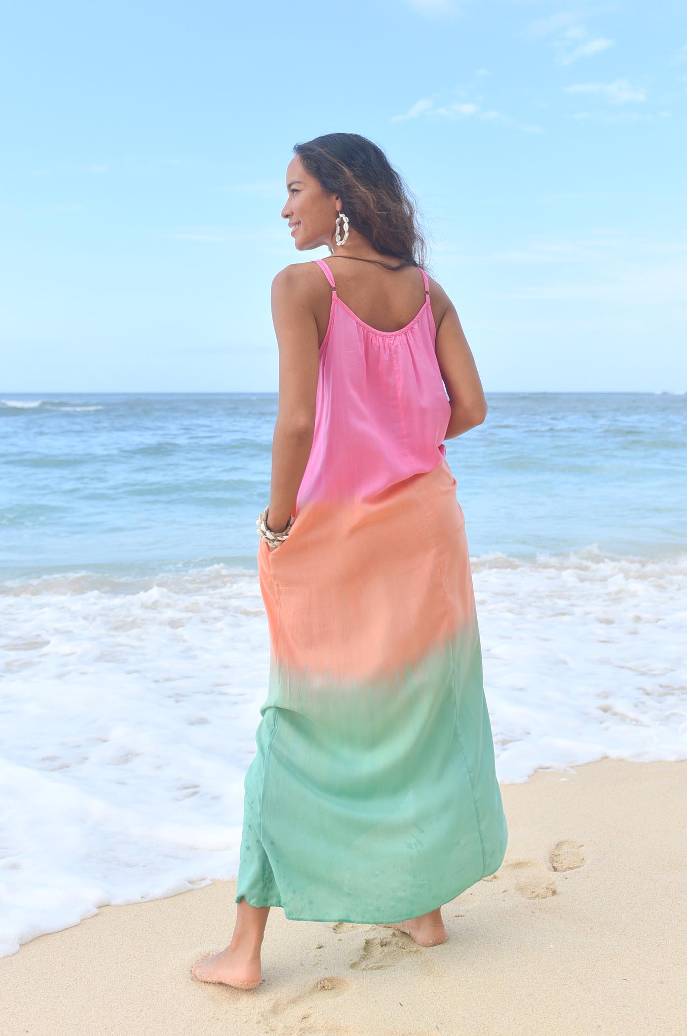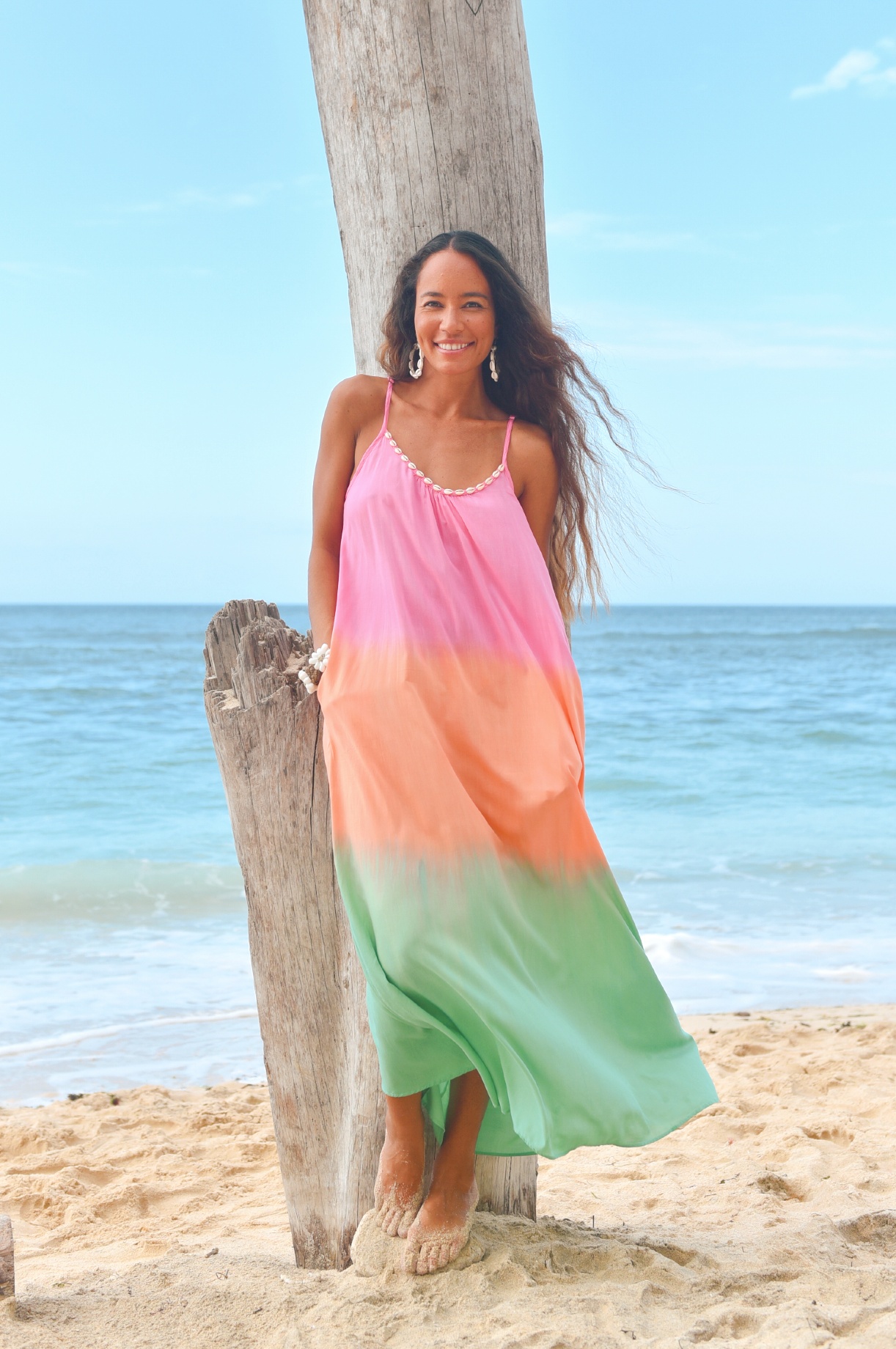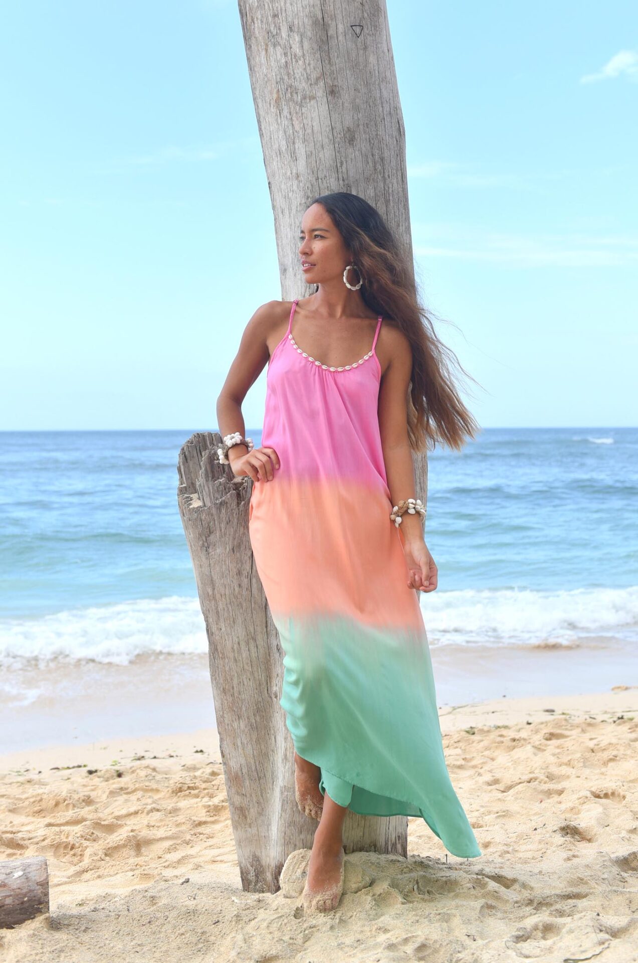 De maxi jurk heeft de kleuren pink, orange en emerald.