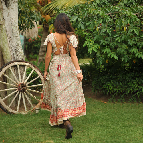 De taille heeft elastiek en een lange rug met gekruiste sierbandjes met een kwastjes, verder heeft de jurk luchtige losse vlindermouwtjes.