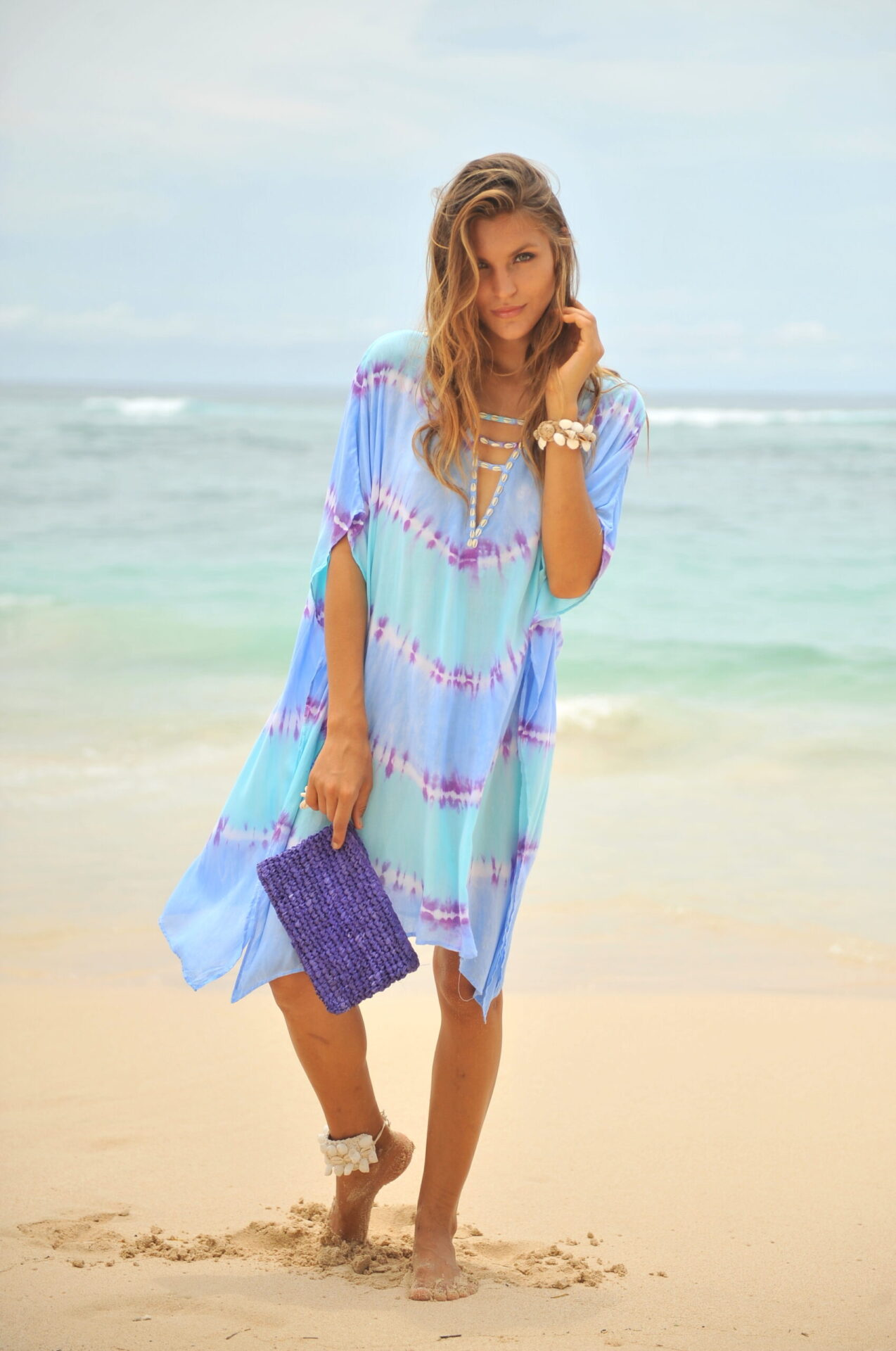 Deze poncho is volgens de tie-dye methode geverfd, de kleur is geïnspireerd op de mooie stranden, die je heel veel ziet op Bali, daar waar deze poncho met de hand gemaakt is op een fair trade manier, waar we heel erg trots op zijn in deze tijd, elke print is daardoor uniek de stof is 100% rayon en valt soepel en zacht en is heerlijk koel in het dragen, en weegt bovendien bijna niets in je koffer, dus deze gaat zeker mee!