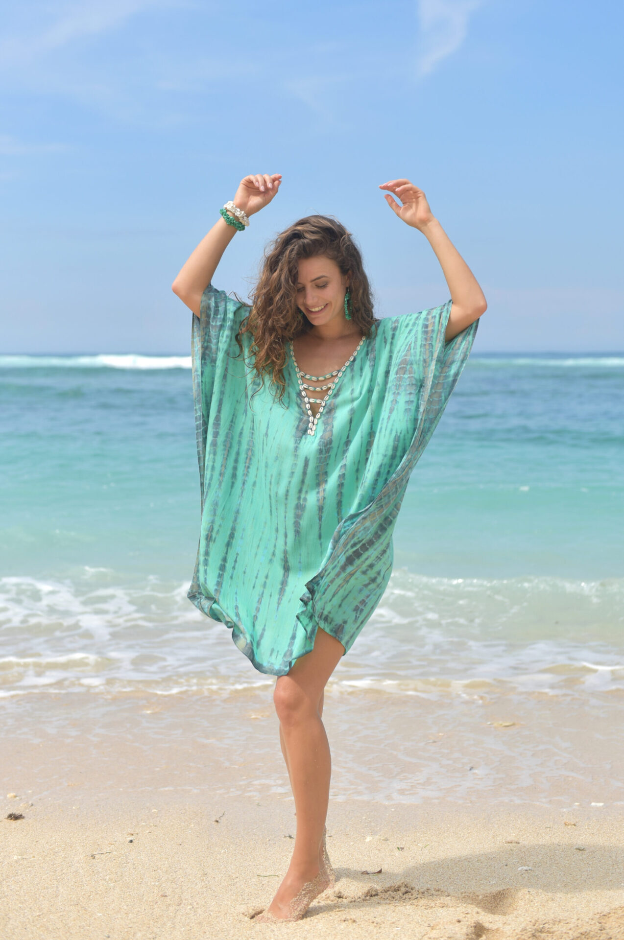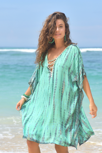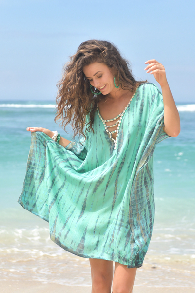 Deze poncho is volgens de tie-dye methode geverfd, de kleur is geïnspireerd op de mooie smaragdgroene zeeën, die je veel ziet op Bali, daar waar deze poncho met de hand gemaakt is op een fair trade manier, waar we heel erg trots op zijn in deze tijd, elke print is daardoor uniek de stof is 100% rayon en valt soepel en zacht en is heerlijk koel in het dragen, en weegt bovendien bijna niets in je koffer, dus deze gaat zeker mee!