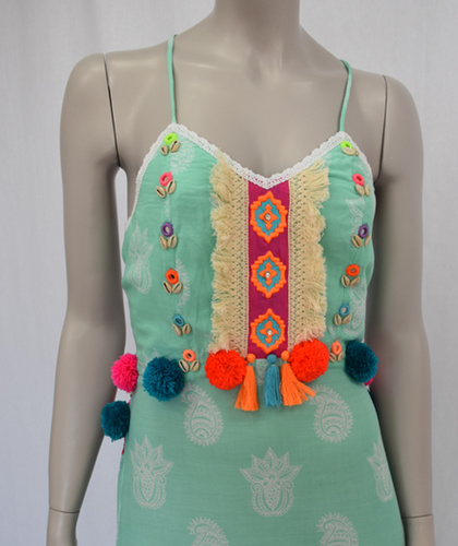 Le devant présente des franges, des pompons, des coquillages, des miroirs, des pompons et une belle broderie avec trois strass.