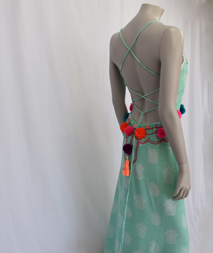 Le dos est décolleté et est fini avec une belle broderie et une paire de pompons.