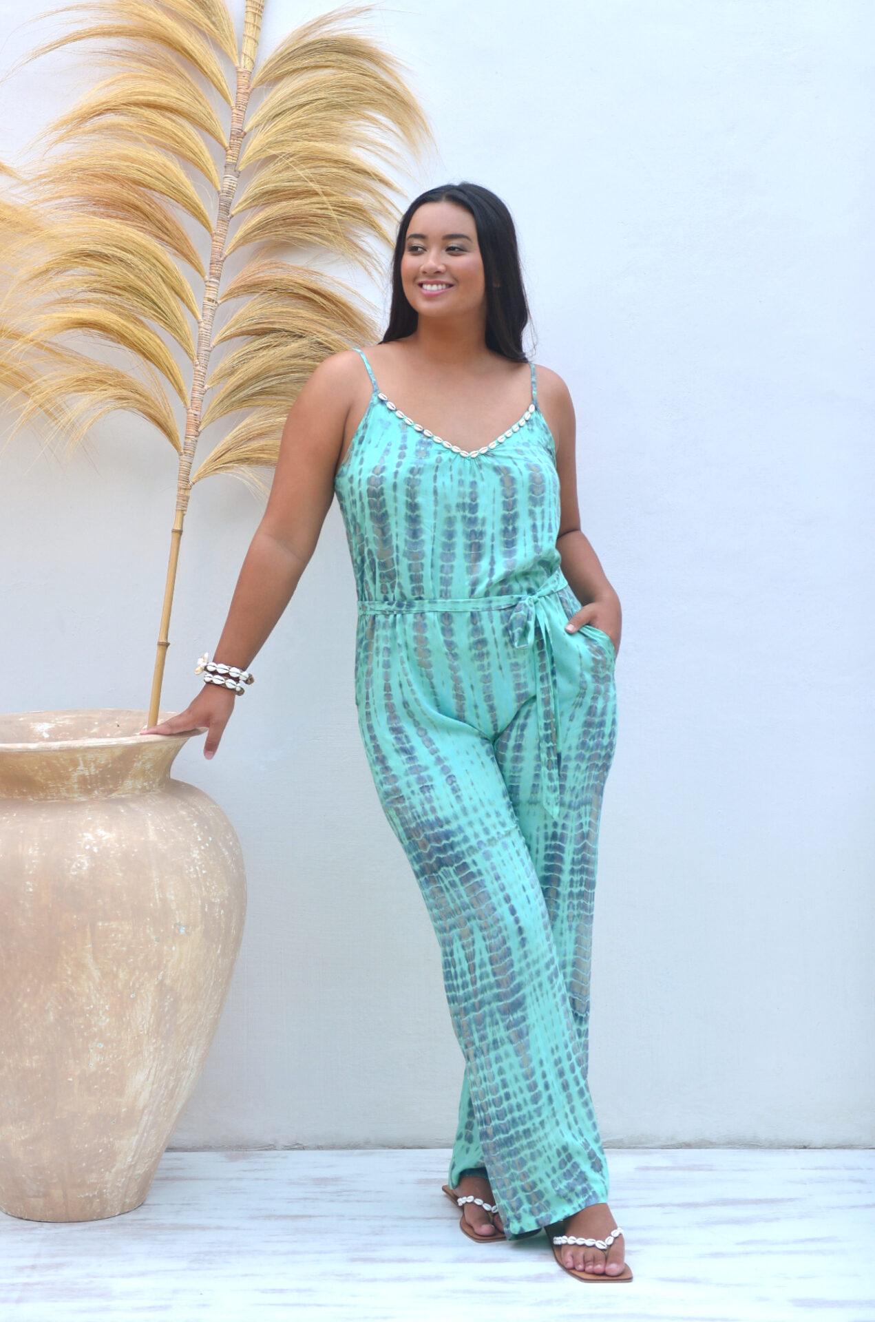 Jumpsuit Anna is een prachtig item versierd met natuurlijke kauri-schelpen, een variant op onze iconische Hot Lava Anna-artikelen.