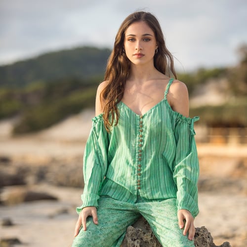 Deze blouse is van het merk Isla Ibiza Bonita en heeft een verticale streepdessin in mooie groen tinten zoals groen, mint en beige.