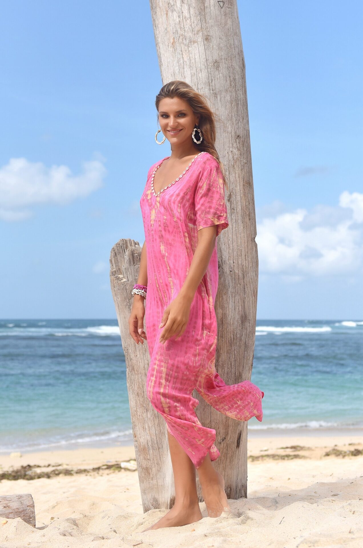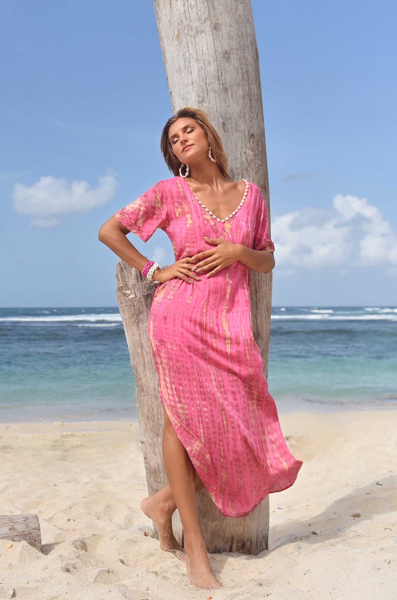 Deze jurk heeft korte mouwtjes en een mooie v-hals met de bekende kauri schelpjes.