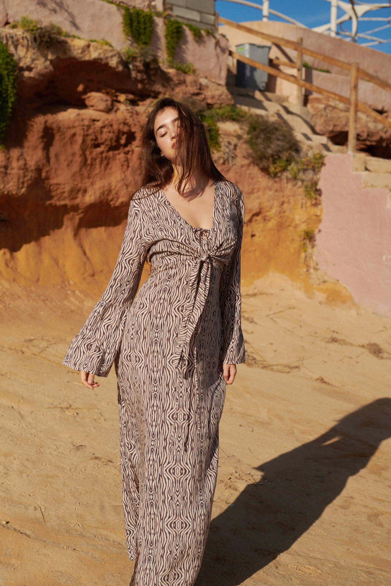 De print is een prachtige wild zebra in bruin met crème – stijlvol, krachtig en toch zacht van kleur. Gemaakt van 100% viscose voelt de stof heerlijk licht en soepel aan, perfect voor warme dagen of zwoele avonden.