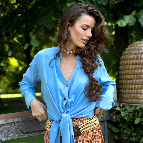 De blouse Fleur heeft twee lange mouwen met aan het uiteindes een boord met splitje en een knoopje, zo kun je ook leuk je mouwen omslaan.