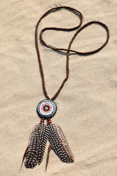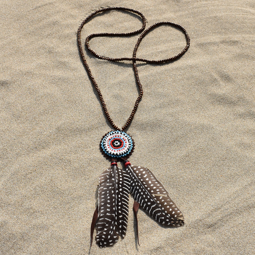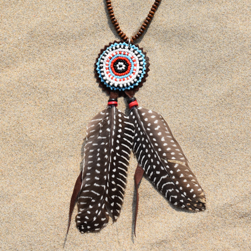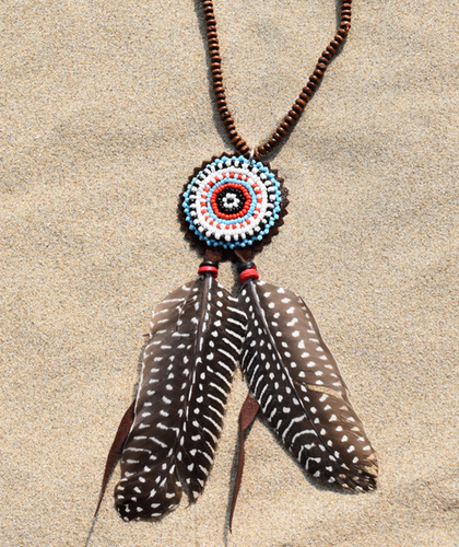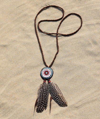 De ketting is gemaakt van houten kralen met een rond indianen kraaltjes motief als hanger, de kleuren van de kraaltjes zijn turquoise, zwart, rood en wit.
