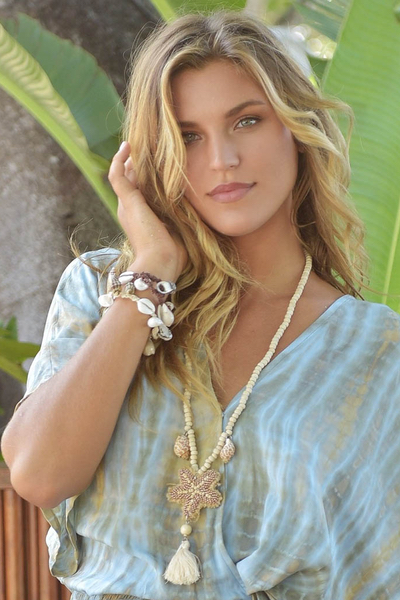 Verder heeft de ketting twee mooie schelpen met aan het uiteinden een hanger van een zeester met een kwast met schelp en visjes hanger van parelmoer.