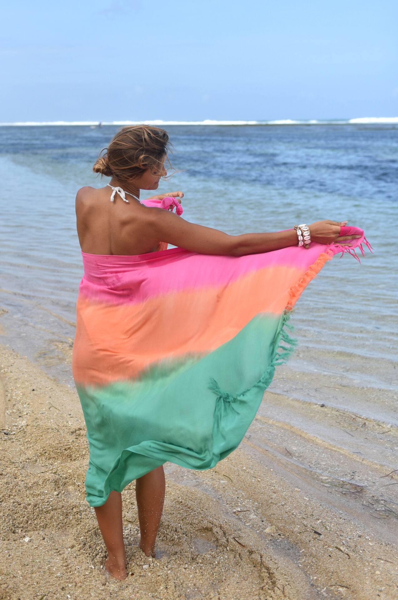 Deze sarong is geverfd volgens de traditionele tie-dye methode. De kleur is geïnspireerd op de prachtige stranden van Bali, waar dit item met de hand en op fair trade wijze wordt gemaakt. Dankzij de kleinschalige productie is elke print uniek en blijft het label exclusief.