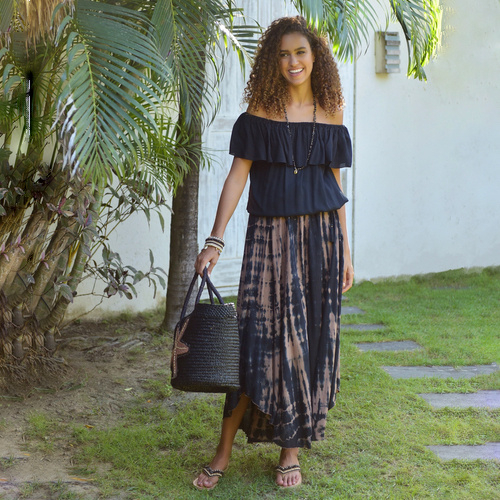 De stof is geverfd volgens de tie-dye methode met de kleuren ivory, taupe beige en bruin met als eind resultaat een mooie print unieke print, dus niet één exemplaar is hetzelfde.