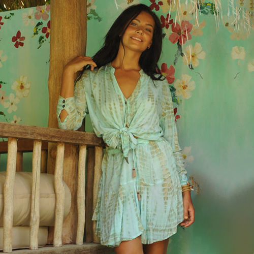 De stof is geverfd volgens de tie-dye methode met de kleuren azuur, aqua, turquoise, beige en wit, met als eind resultaat een mooie unieke print, dus niet één exemplaar is hetzelfde.