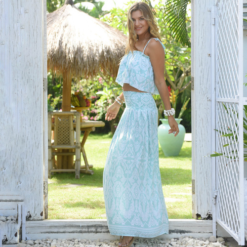 De maxi skirt Rosa heeft een mooie etnische print die je veel ziet op Bali, daar waar deze rok/jurk met de hand gemaakt is op een fair trade manier, waar we heel erg trots op zijn in deze tijd, elke print is daardoor uniek de stof is 100% rayon en valt soepel en zacht en is heerlijk koel in het dragen, en weegt bovendien bijna niets in je koffer, dus deze gaat zeker mee!