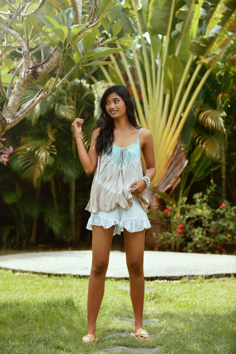 Langs de halslijn zitten schelpjes en de dunnen spaghetti schouderbandjes zijn verstelbaar.