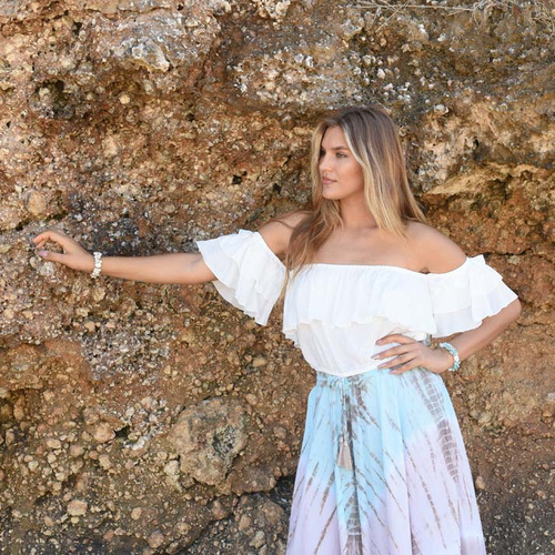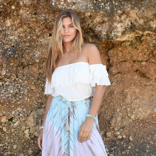 De top is op een fair trade manier, waar we heel erg trots op zijn in deze tijd, elke print is daardoor uniek de stof is 100% rayon en valt soepel en zacht en is heerlijk koel in het dragen, en weegt bovendien bijna niets in je koffer, dus deze gaat zeker mee!
