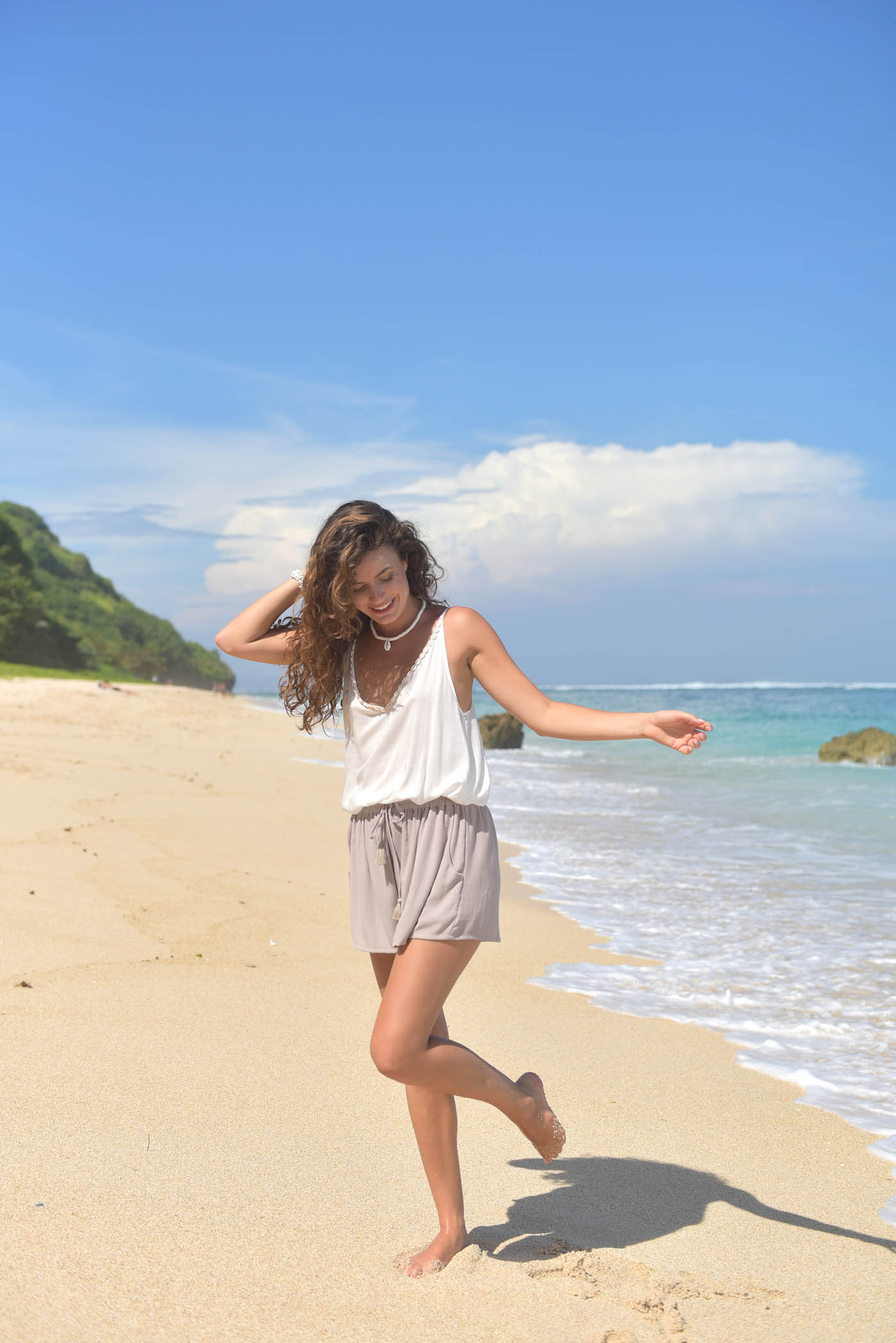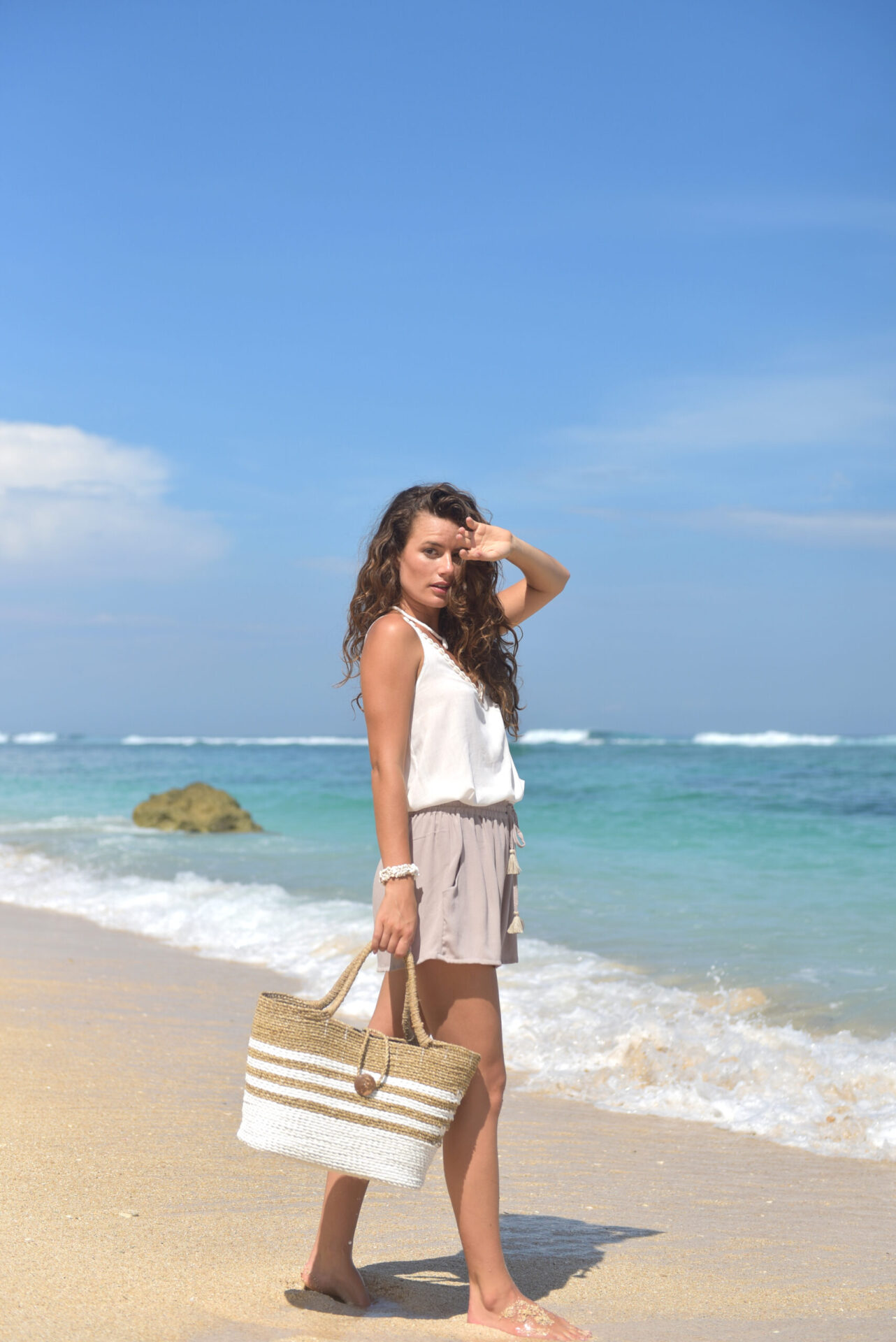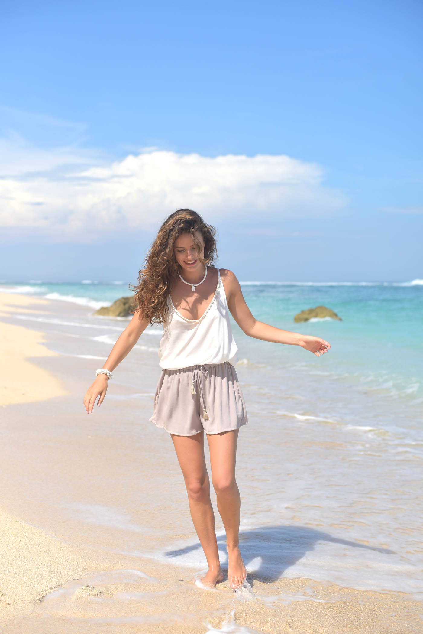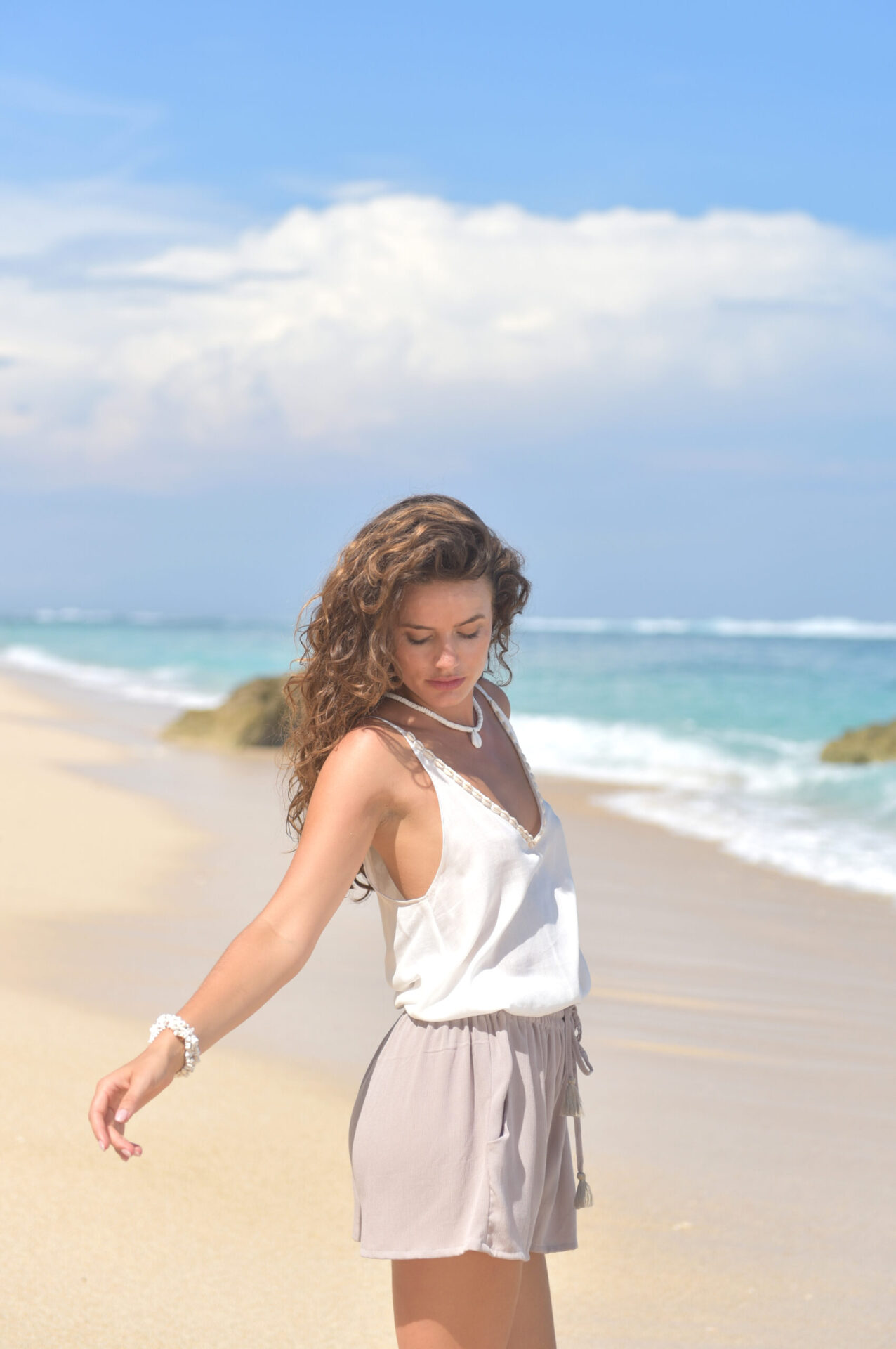 Verder heeft de top verstelbare bandjes en heeft een mooie V-hals met een rij kauri schelpen erlangs.