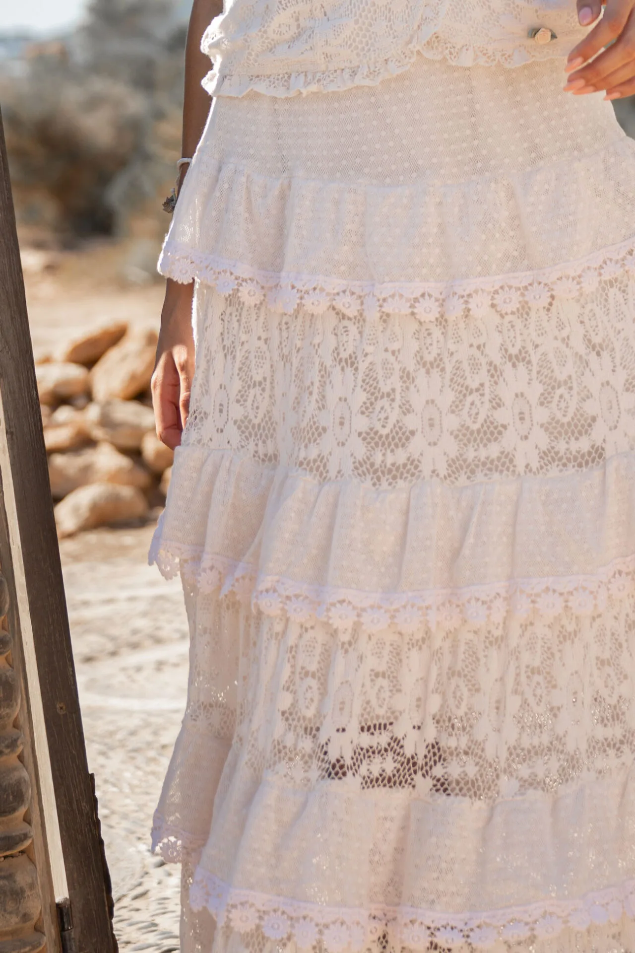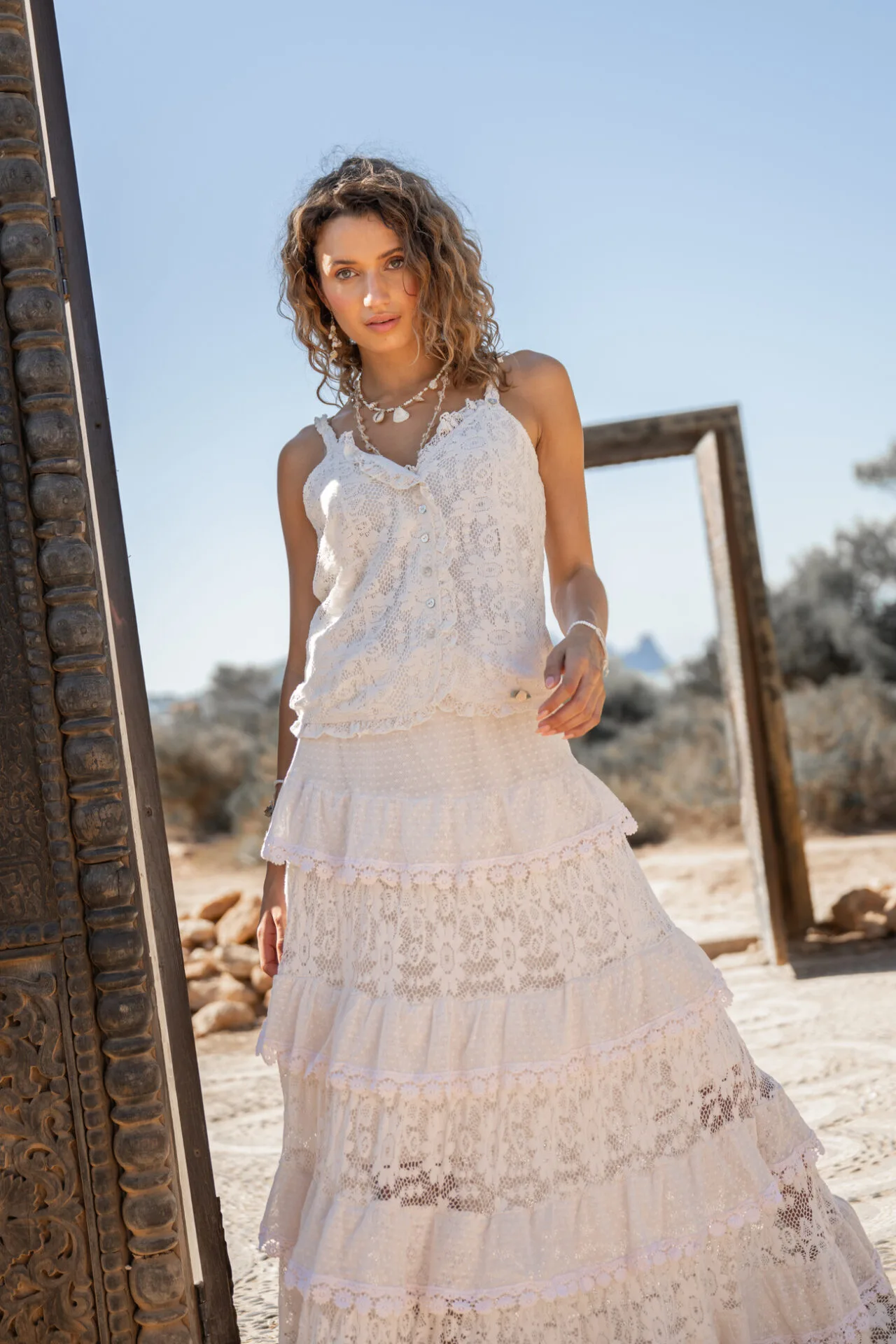De Long Skirt Lace Cream is een lange kanten rok uit de Romantic Soul collectie van Isla Ibiza Bonita. Deze rok is opgebouwd uit meerdere lagen en verschillende kanten banen, wat zorgt voor een speelse en vrouwelijke look. De cream kleur geeft de lange kanten rok een zachte uitstraling en maakt haar makkelijk te combineren binnen een bohemian garderobe.