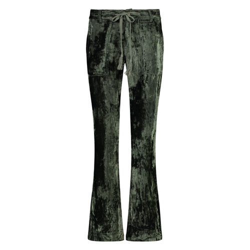 Velvet broek van Isla Ibiza, heeft een mooie glans en wijde pijpen. De broek heeft grote zakken, kleine zakjes op de achterkant en gaat dicht met de hartjes knoop. Naast dat de broek in de heupen met het touwtje kan worden aangetrokken, kan er ook een riem doorheen worden gedragen.