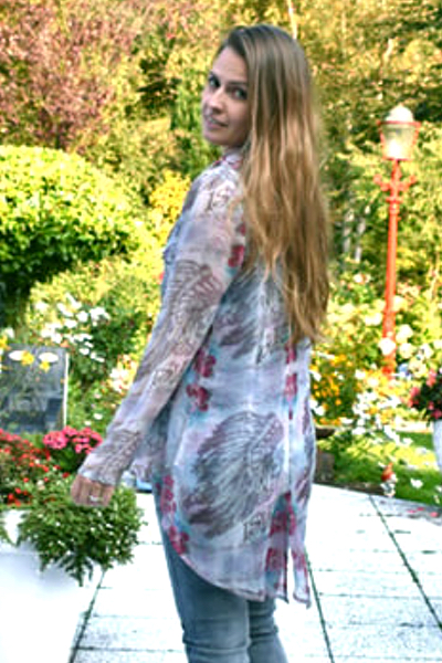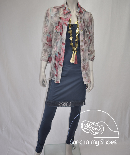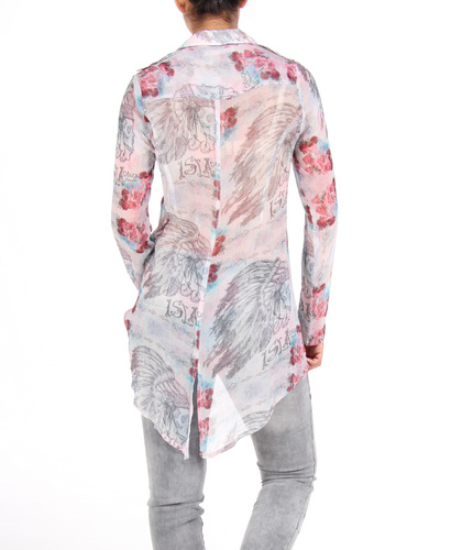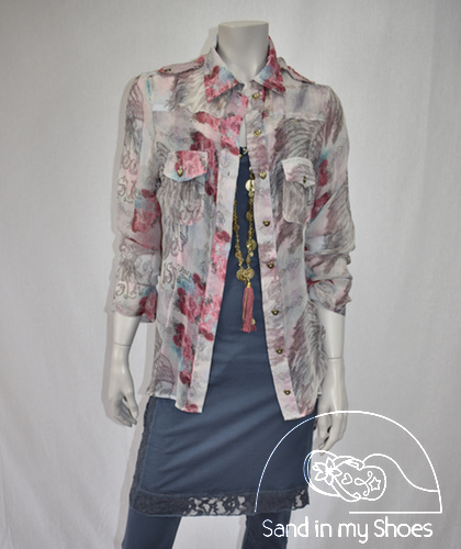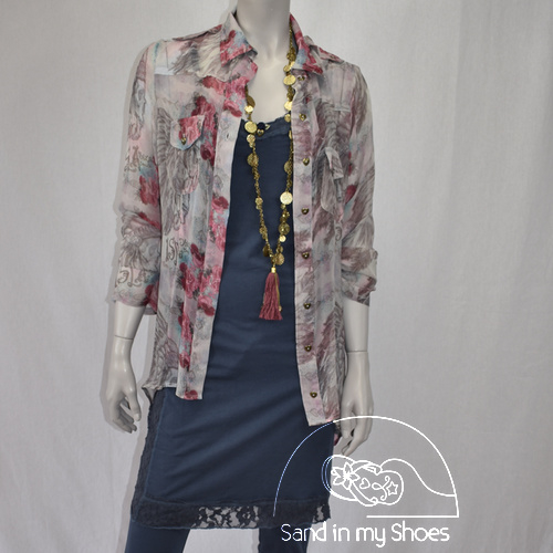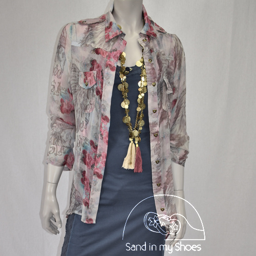 Deze blouse is van het merk Isla Ibiza en is gemaakt van een heerlijke soepel vallende en doorschijnende stof in de kleuren grijs, roze, lila en blauw.