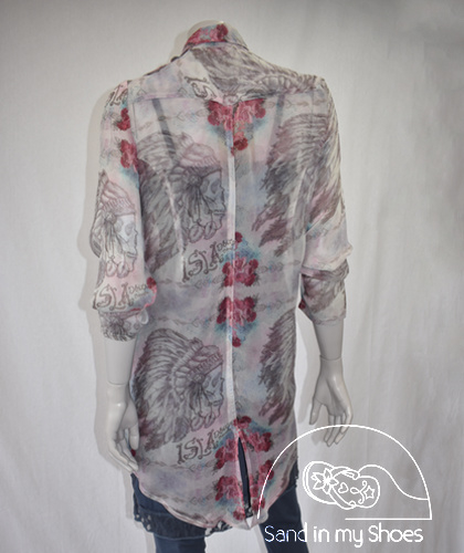 De lieve kleurige print is met een doodshoofd met een indianentooi en heel veel rozen.