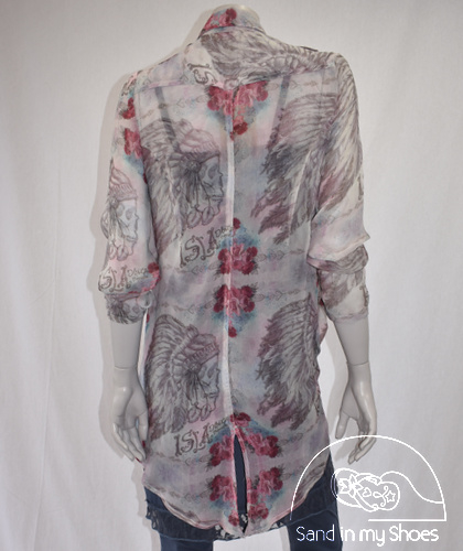 Als extra detail heeft de blouse epauletten op de schouders en is de achterkant langer en heeft een split, achter is 15 cm langer als de voorkant.