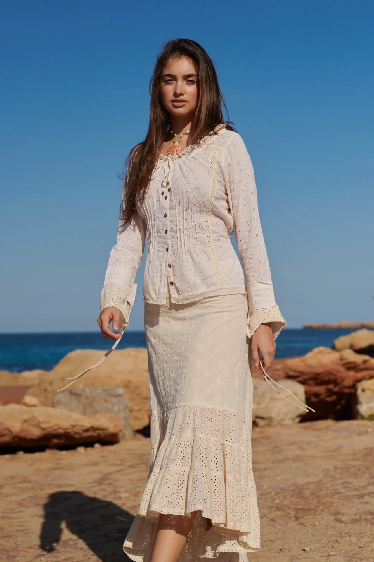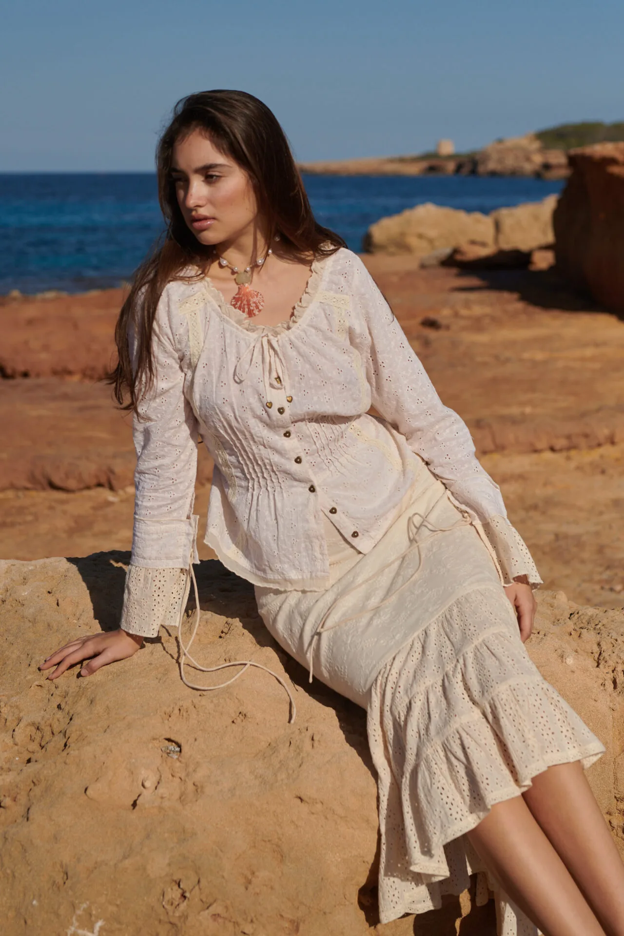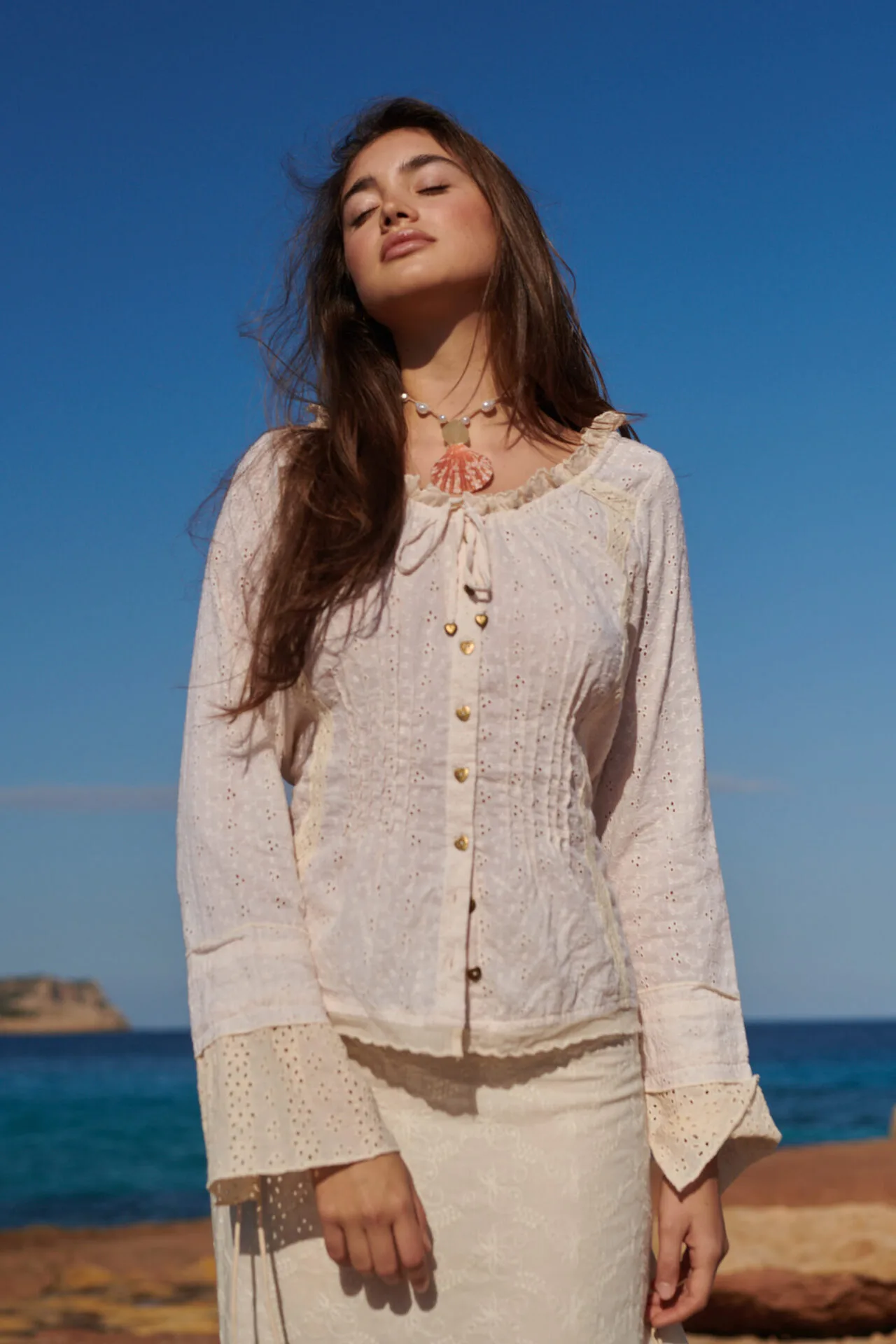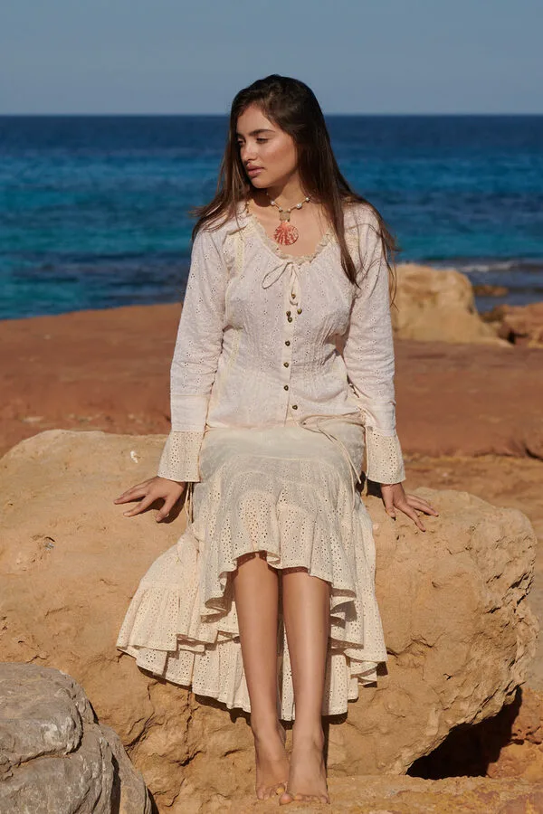 De blouse is licht getailleerd en heeft langs de hals een verfijnd schulp randje. Aan de hals zit een smal koord waarmee je de halslijn eventueel kunt rimpelen voor een speels effect. De bekende Isla Ibiza metalen hartjesknoopjes geven de blouse die herkenbare, charmante finishing touch.