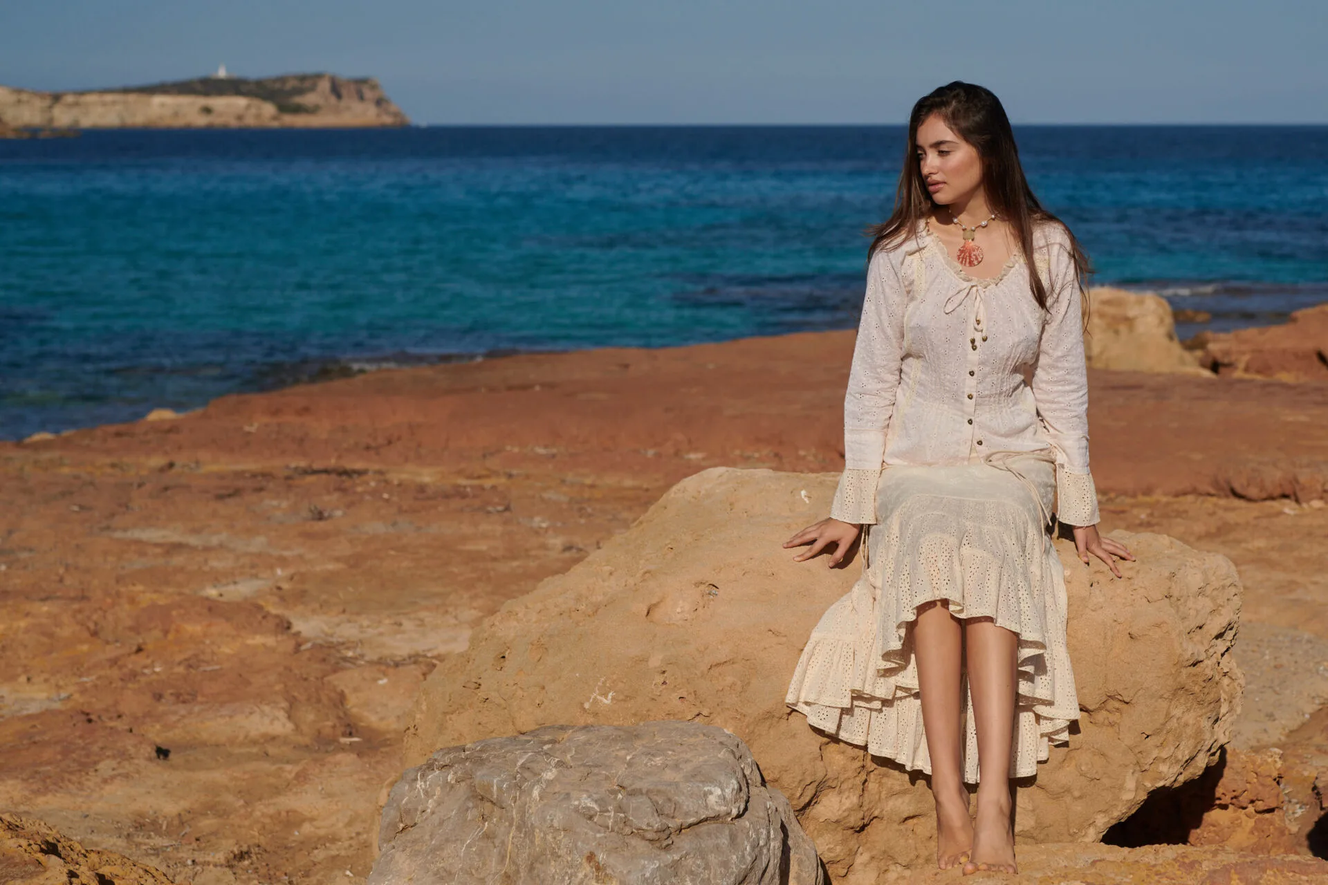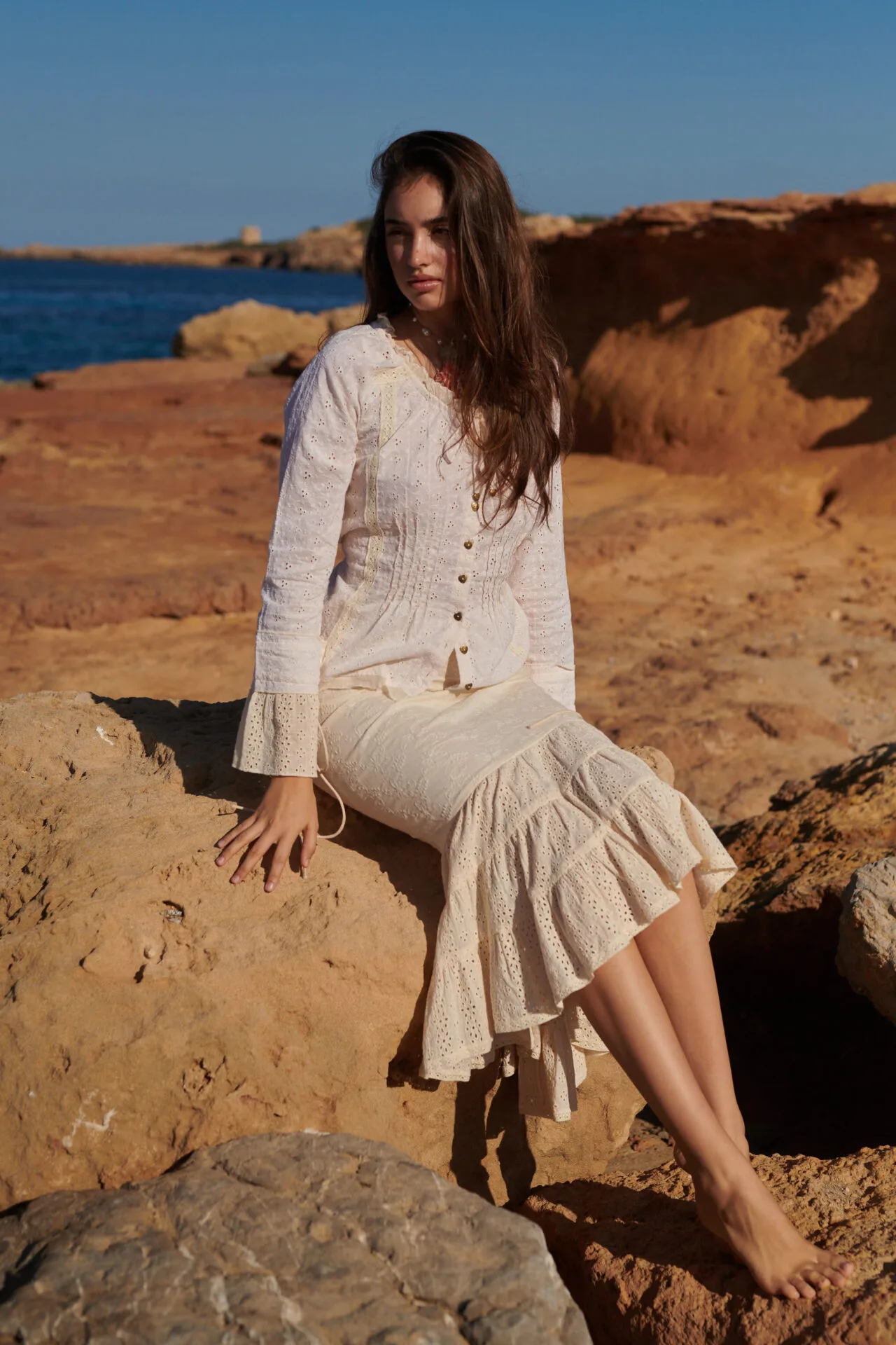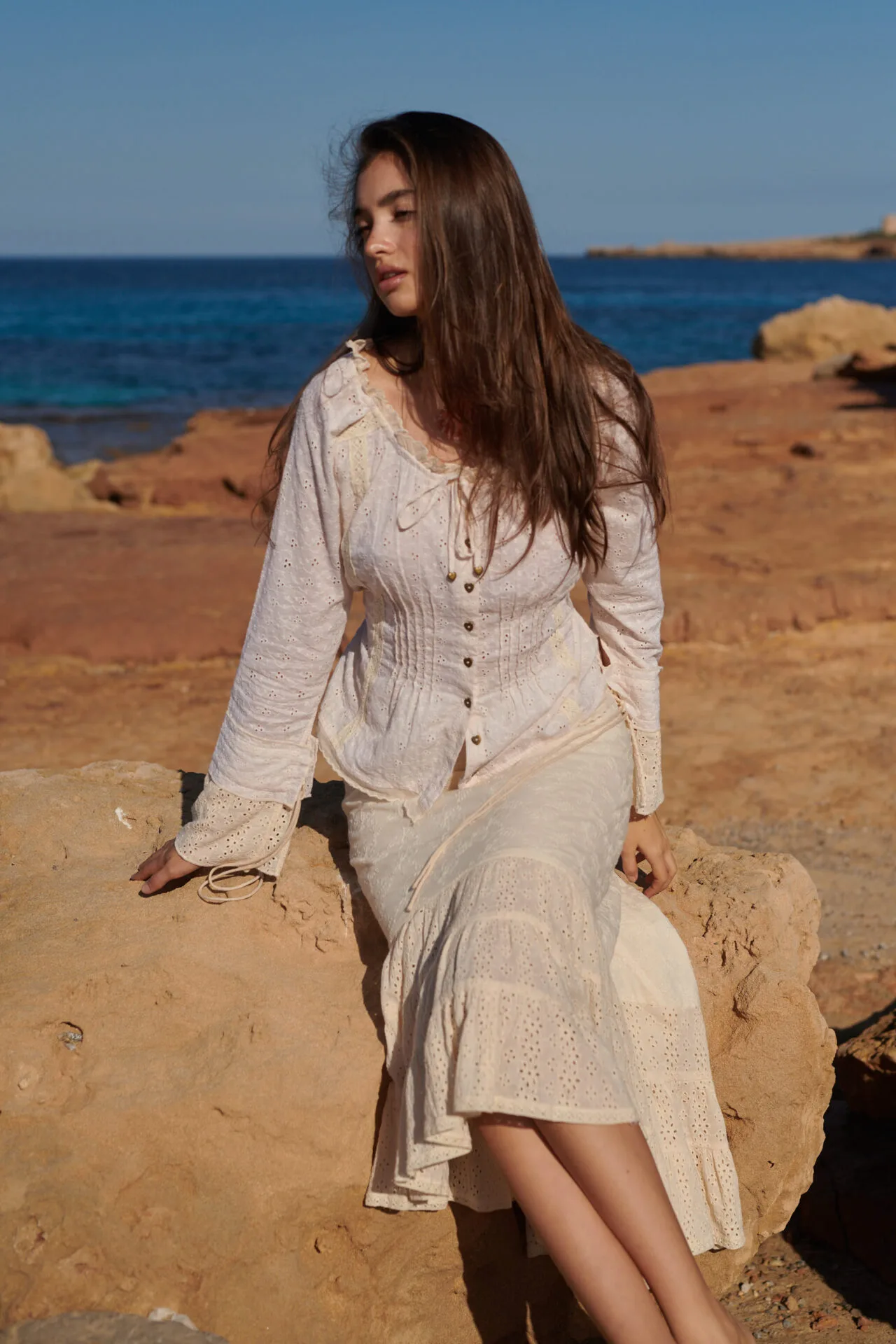De blouse is licht getailleerd en heeft langs de hals een verfijnd schulp randje. Aan de hals zit een smal koord waarmee je de halslijn eventueel kunt rimpelen voor een speels effect. De bekende Isla Ibiza metalen hartjesknoopjes geven de blouse die herkenbare, charmante finishing touch.