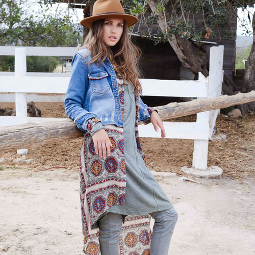 De blouse is van 100% viscose stof en is lang en valt iets boven de enkel en heeft een all over print in de kleuren legergroen, indian rood, okergeel, petrol en beige, met een knoop sluitng van boven tot aan de onderkant, met de bekende hartjes knoopjes van Isla ibiza.