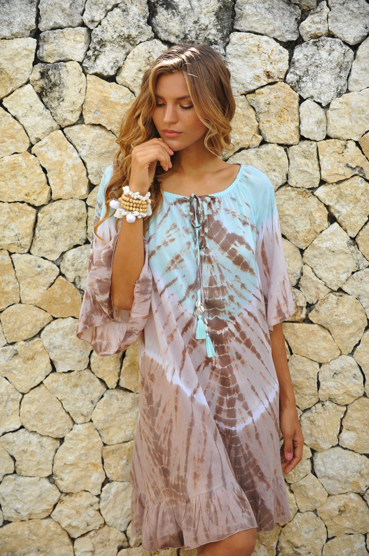 De hals is rond met een V-hals en heeft twee koordjes met kwastjes schelpjes zodat zelf je kunt bepalen of je de jurk open of dicht wilt dragen.