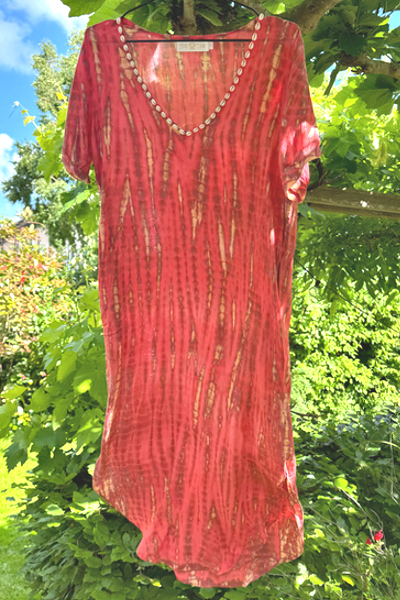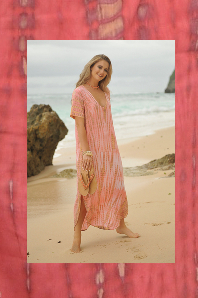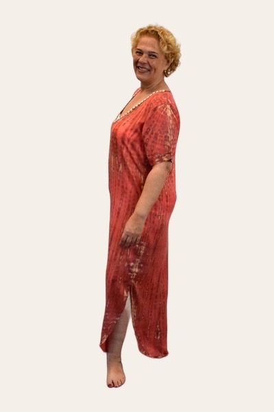 Deze jurk is volgens de tie-dye methode geverfd, de kleur is geïnspireerd op de mooie oranje rode kleur van de ondergaande zon die je veel ziet op Bali, daar waar deze jurk met de hand gemaakt is op een fair trade manier, waar we heel erg trots op zijn in deze tijd, elke print is daardoor uniek de stof is 100% rayon en valt soepel en zacht en is heerlijk koel in het dragen, en weegt bovendien bijna niets in je koffer, dus deze gaat zeker mee!