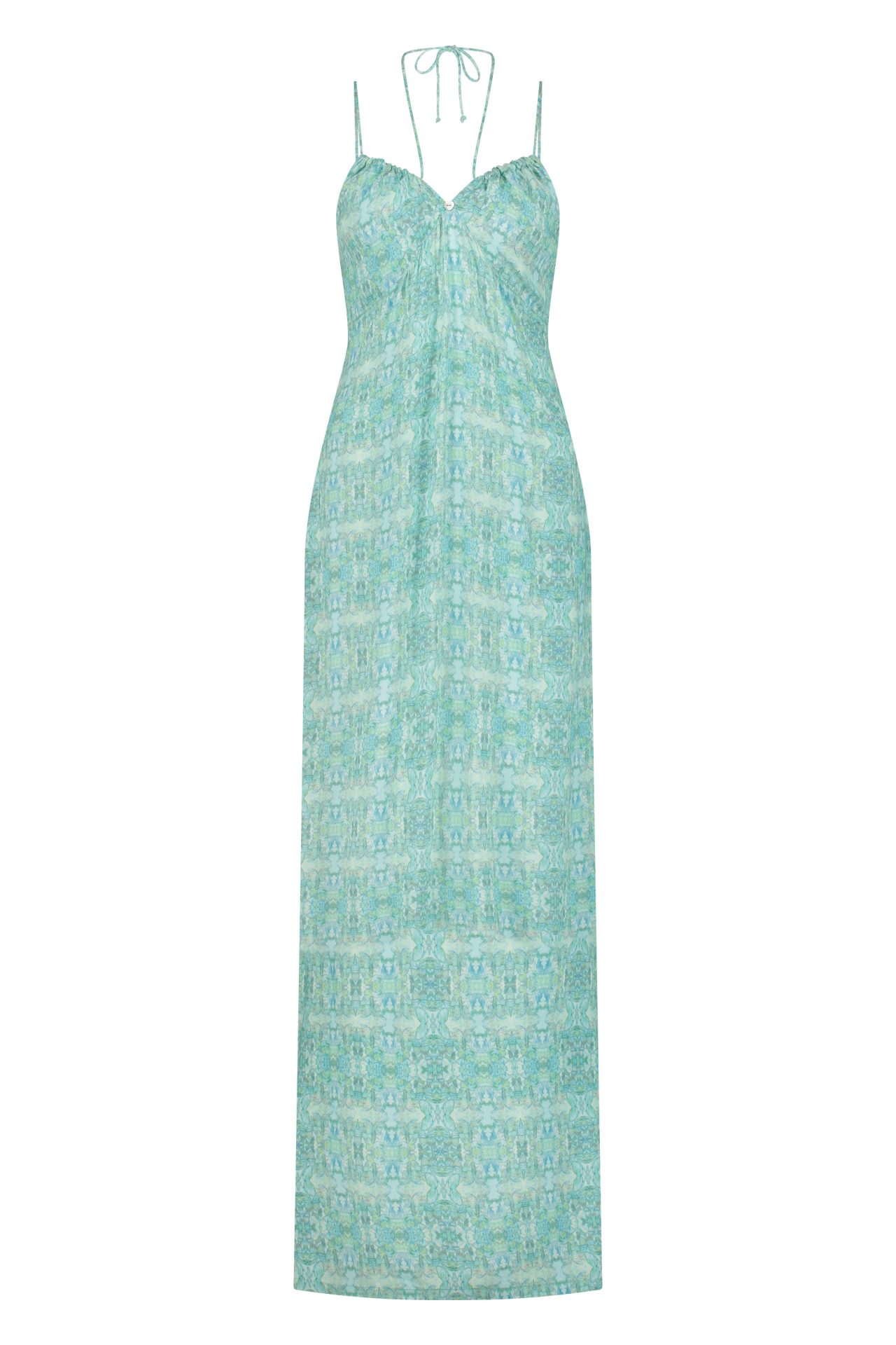 De jurk heeft de kleuren van de zee, zoals turquoise, mint, aqua en groen, verder heeft de jurk dunne spaghetti bandjes die door een tunneltje van het bovenstukje lopen, zodat je het bij de borsten het, strakker of losser kunt dragen en de rimpeltjes in de stof mooi kunt verdelen , de koordjes komen er in het midden van de borsten naar buiten, die kun je gestrikt dragen of als een halter om je nek dragen.