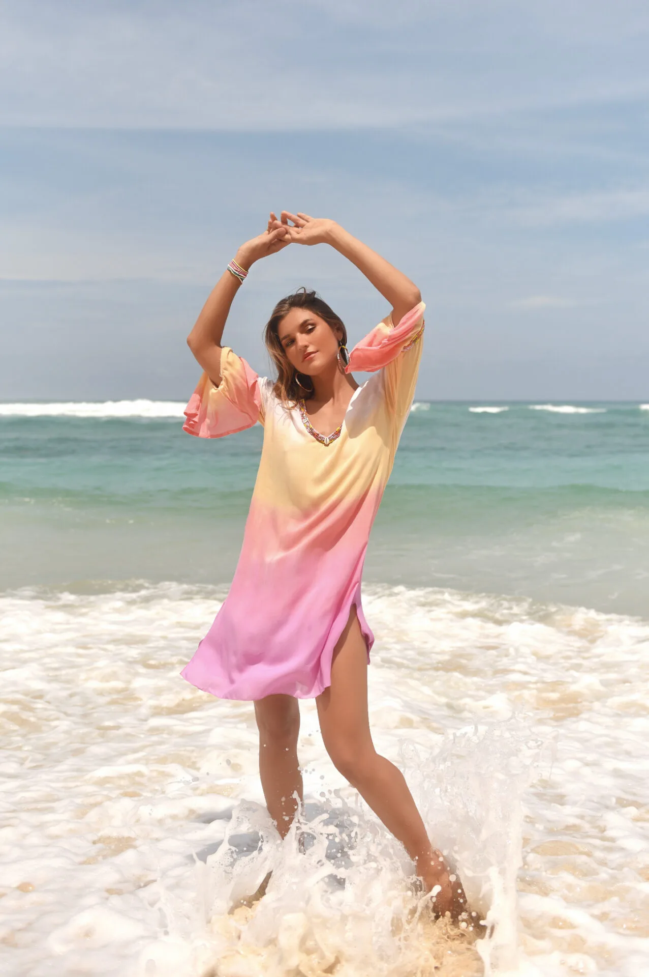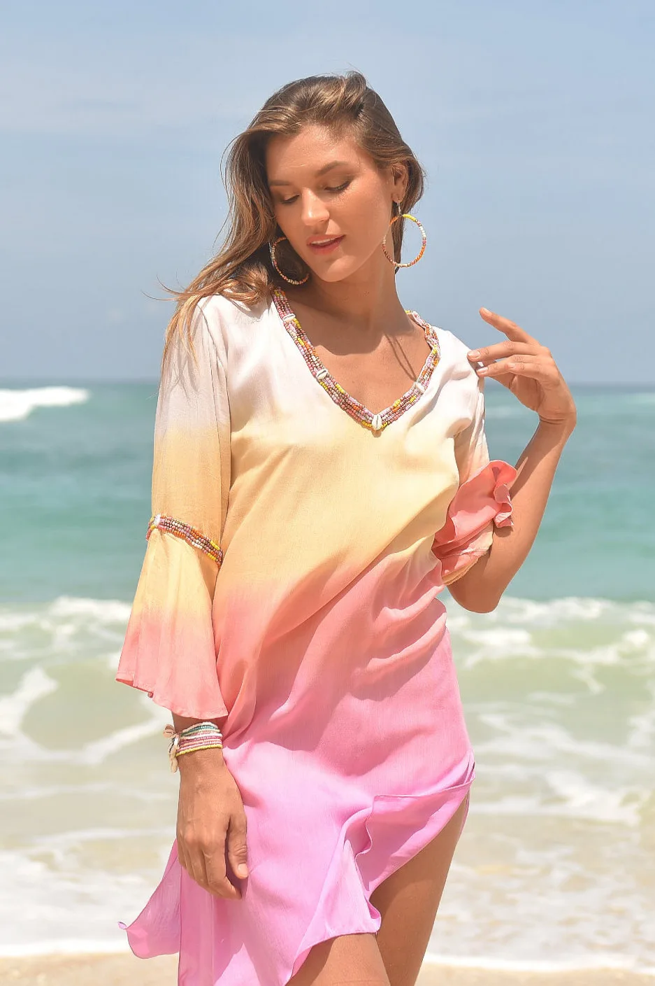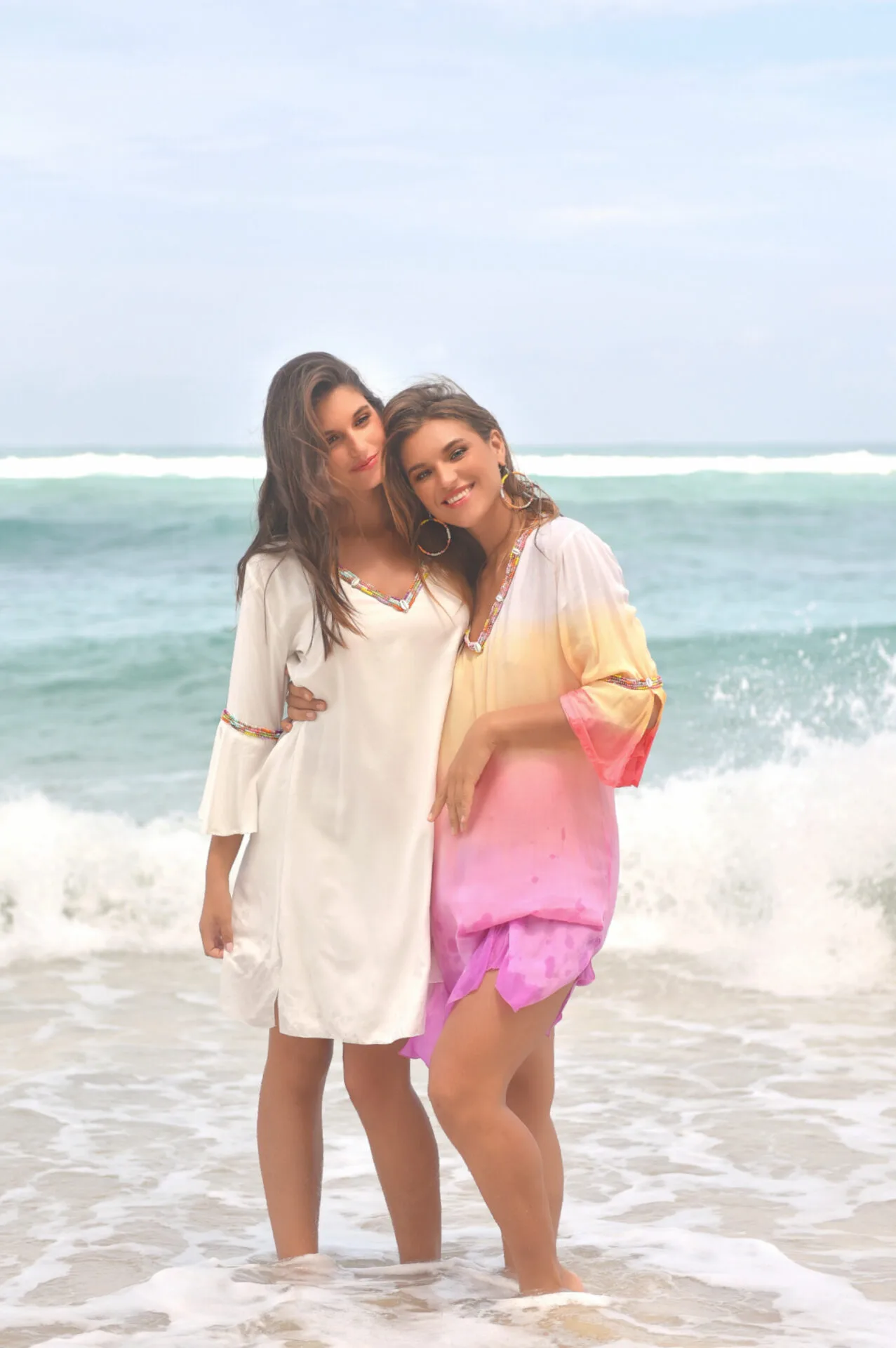 Deze tuniek is rijk afgewerkt met een uniek handgemaakt kralenontwerp en prachtige kauri schelpen langs de V-hals, wat zorgt voor een subtiele, luxe beach uitstraling. De uitlopende driekwartmouwen, versierd met bijpassende kralen, geven de tuniek een extra vrouwelijke en speelse touch.