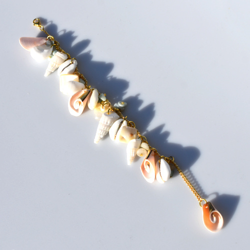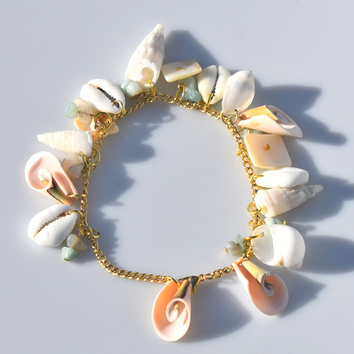 Goudkleurig verstelbaar kettinkje bezet met verschillende schelpjes en stenen kraaltjes.