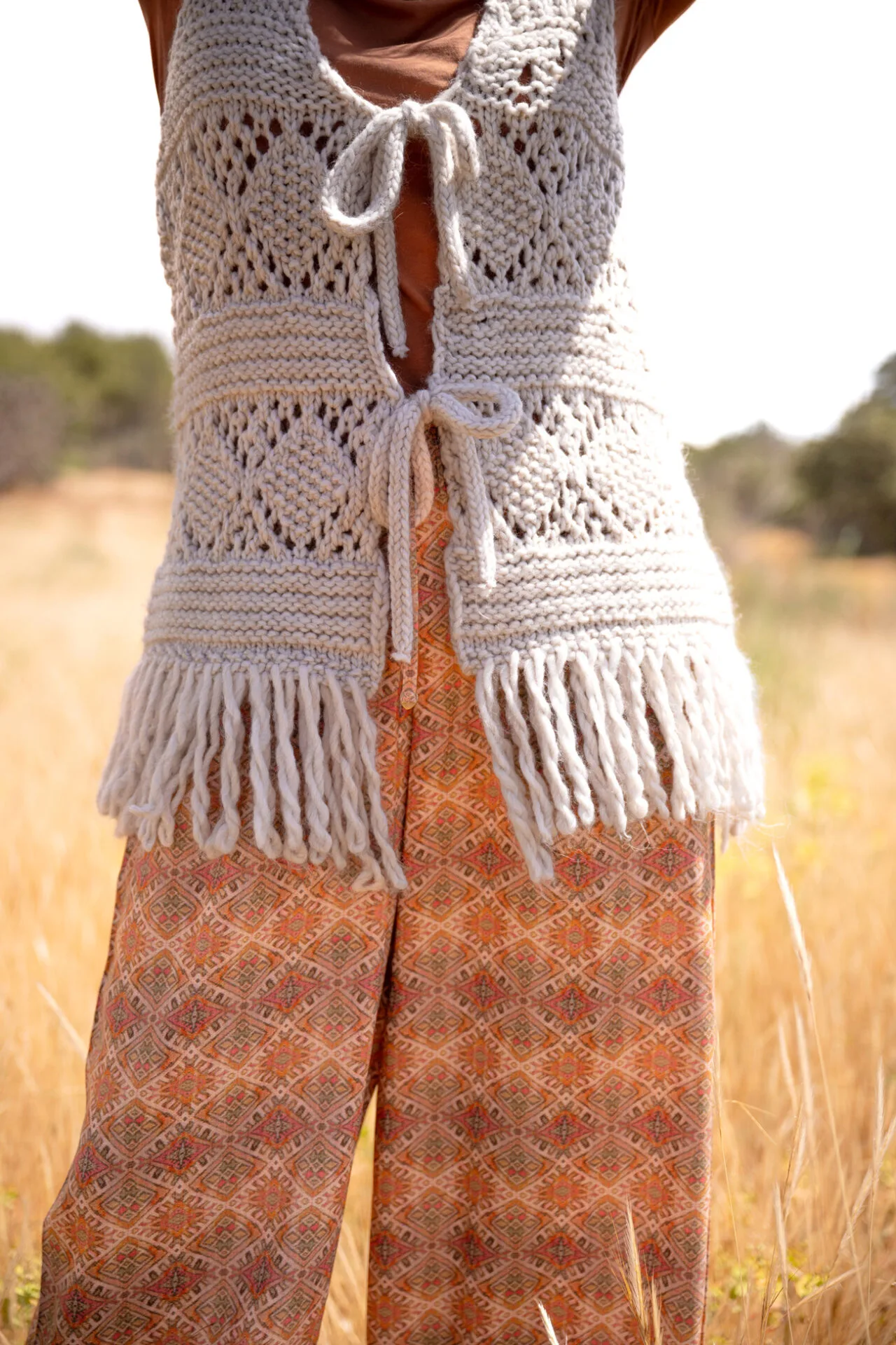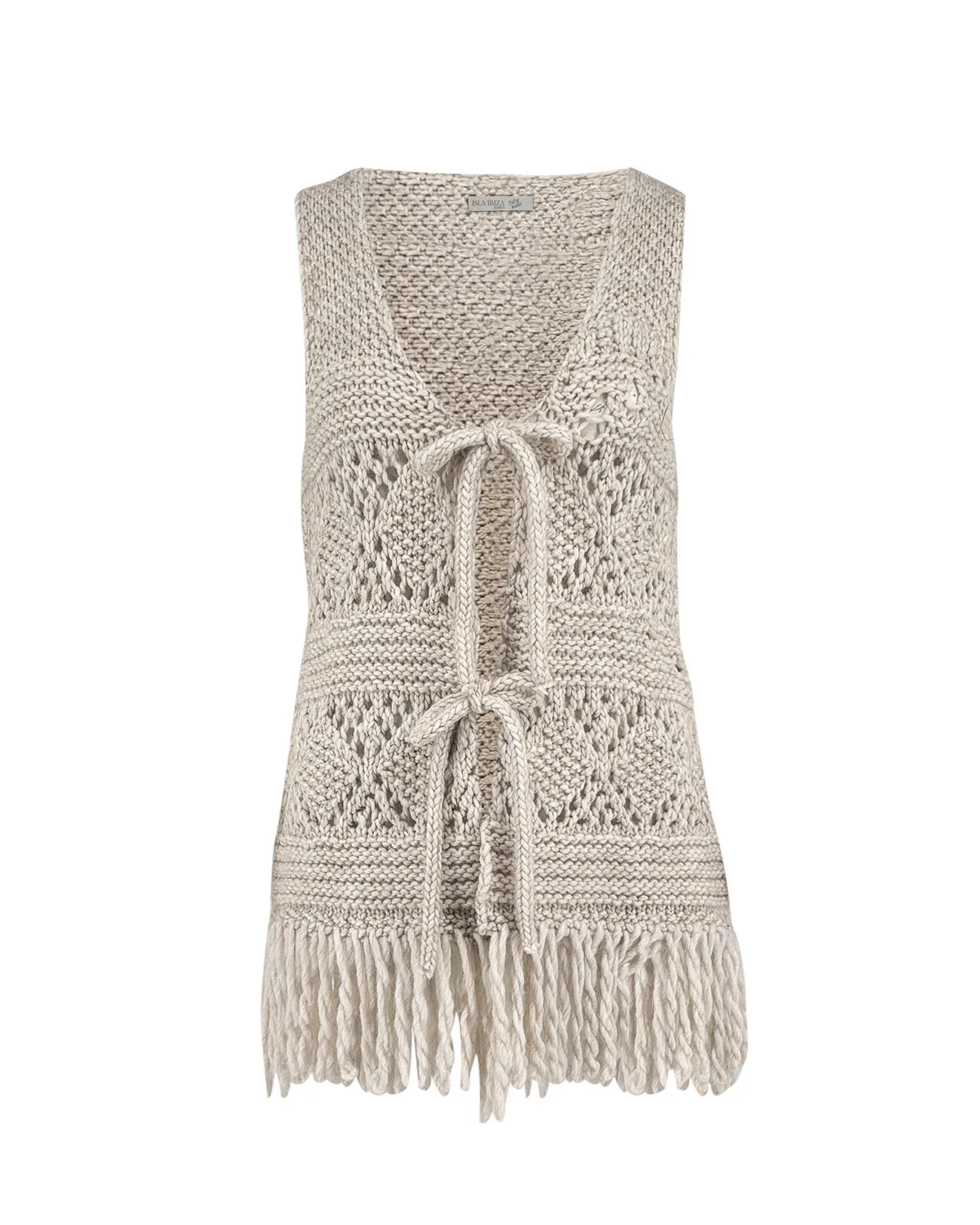 Gebreid gilet met franjes, striksluiting aan de voorkant, heeft een gebreid dessin